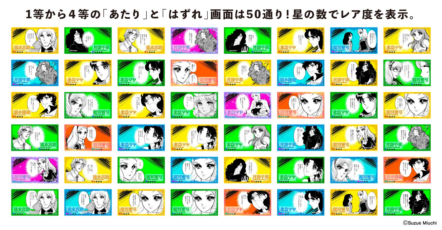 「ガラスの仮面」の名場面やセリフを「あたり」「はずれ」合計50通りご用意しておりますので、「ガラスの仮面」世代や、「ガラスの仮面」ファンには、期間中何度でもお楽しみいただけます。