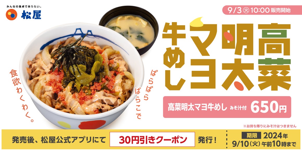 また、2024年9月3日(火)10時~9月10日(火)10時までモバイルクーポンにてご注文いただくと、「高菜明太マヨ牛めし」が30円引きの価格にてお買い求めいただけます。この機会にぜひ、お召し上がりください。