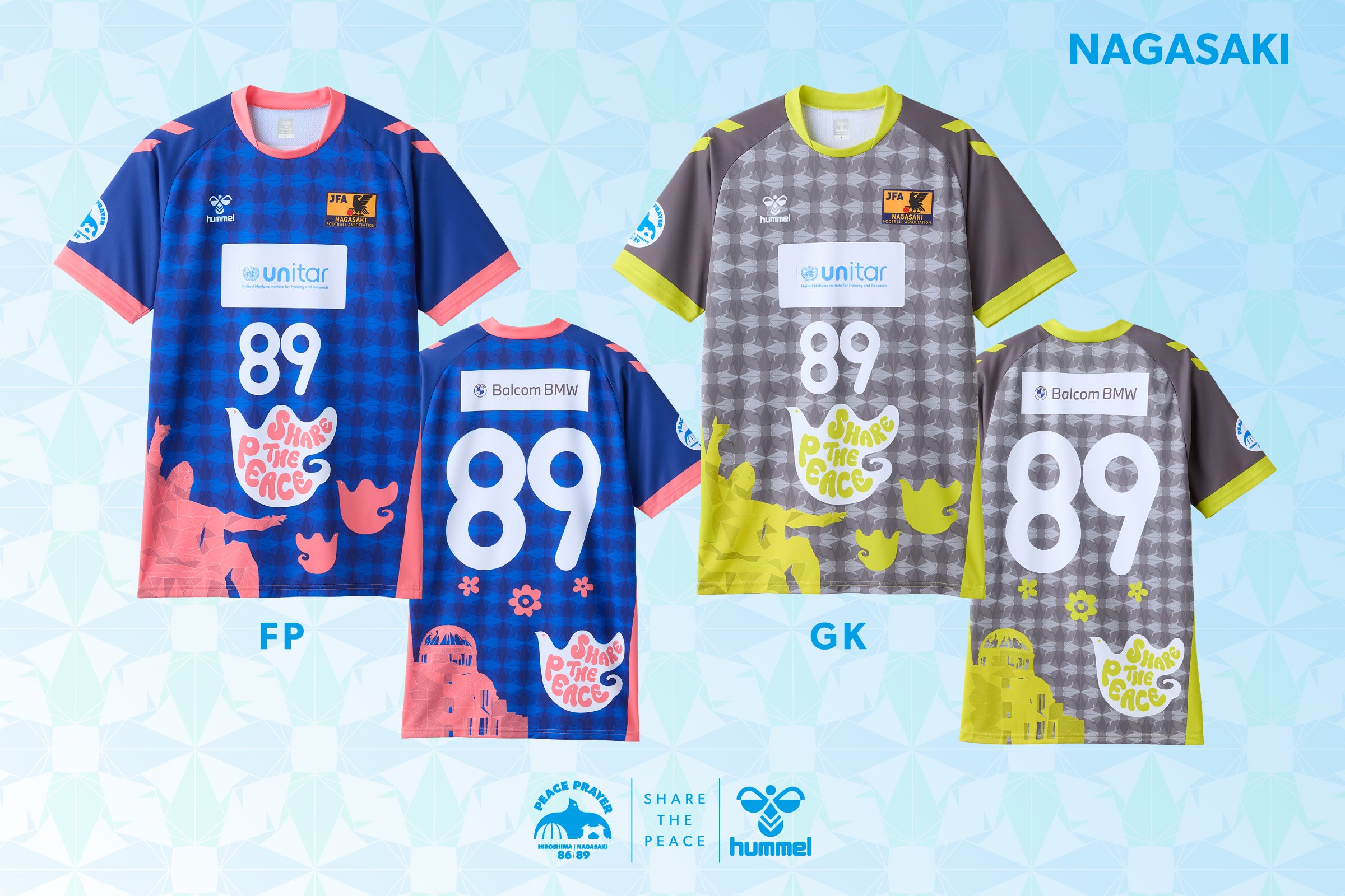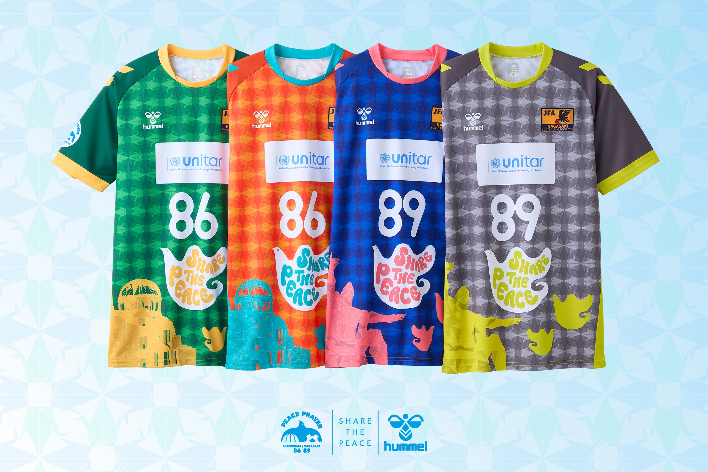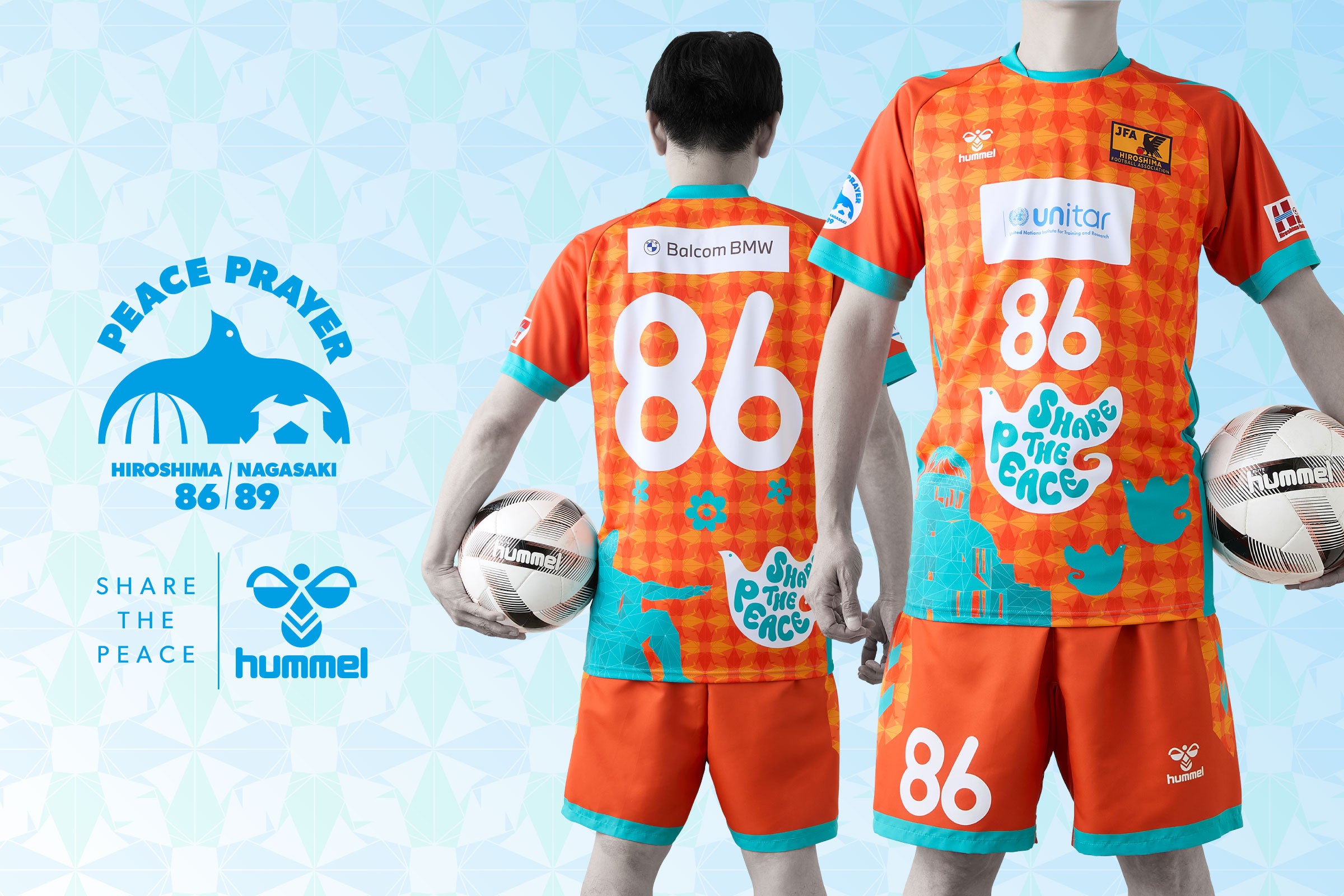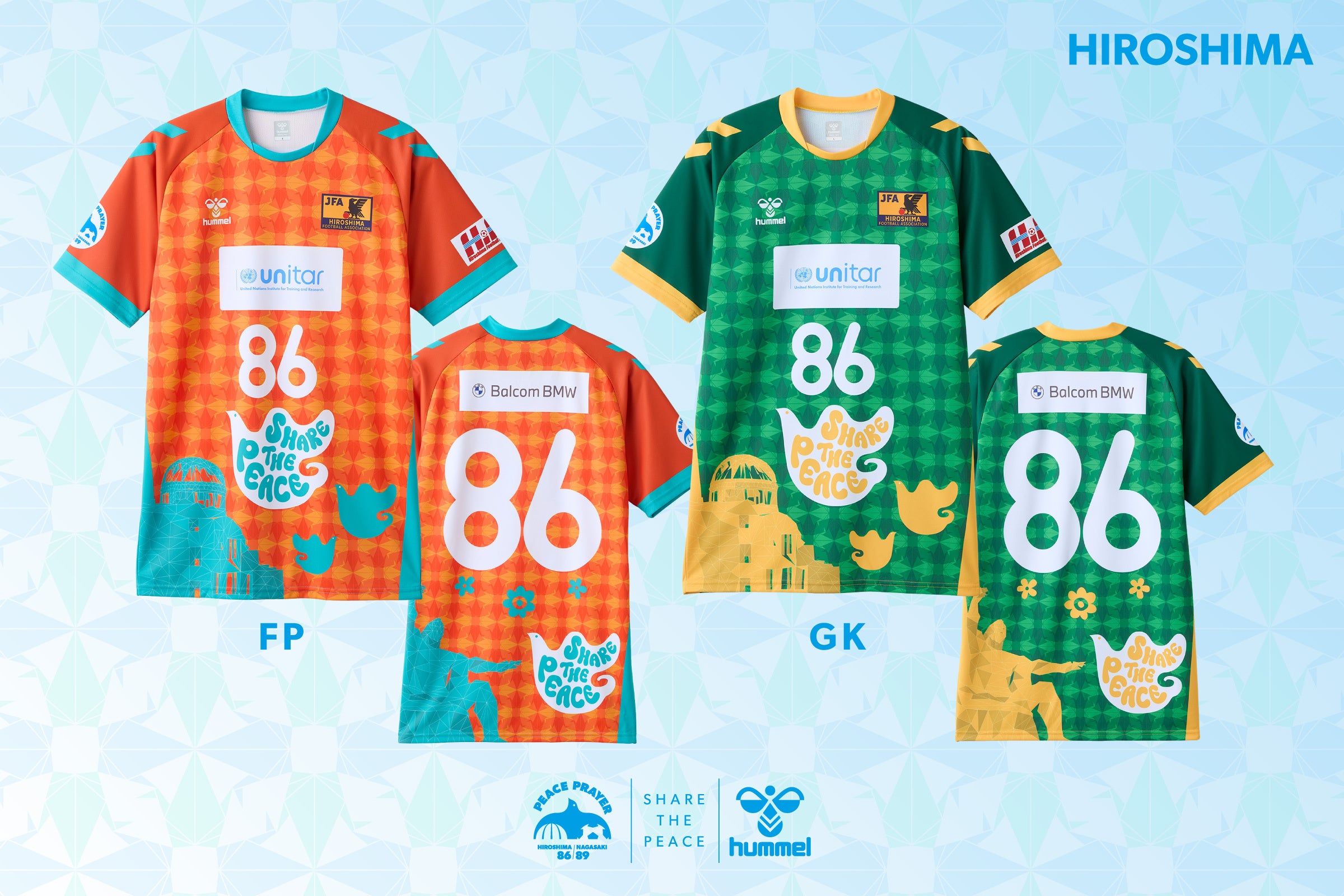 ピースマッチの第1回大会となる2019年より、エキップメントパートナーを務めるヒュンメルは、両チームのユニフォームを担当。原爆ドームと平和祈念像という両県の平和のシンボルをどちらのシャツにもデザインし、平和の象徴であるハトを『SHARE THE PEACE』というメッセージとともに羽ばたかせました。また、胸には平和都市・広島に設立された最初の国連機関である国連訓練調査研究所(ユニタール)のロゴが入り、平和の発信を後押しします。