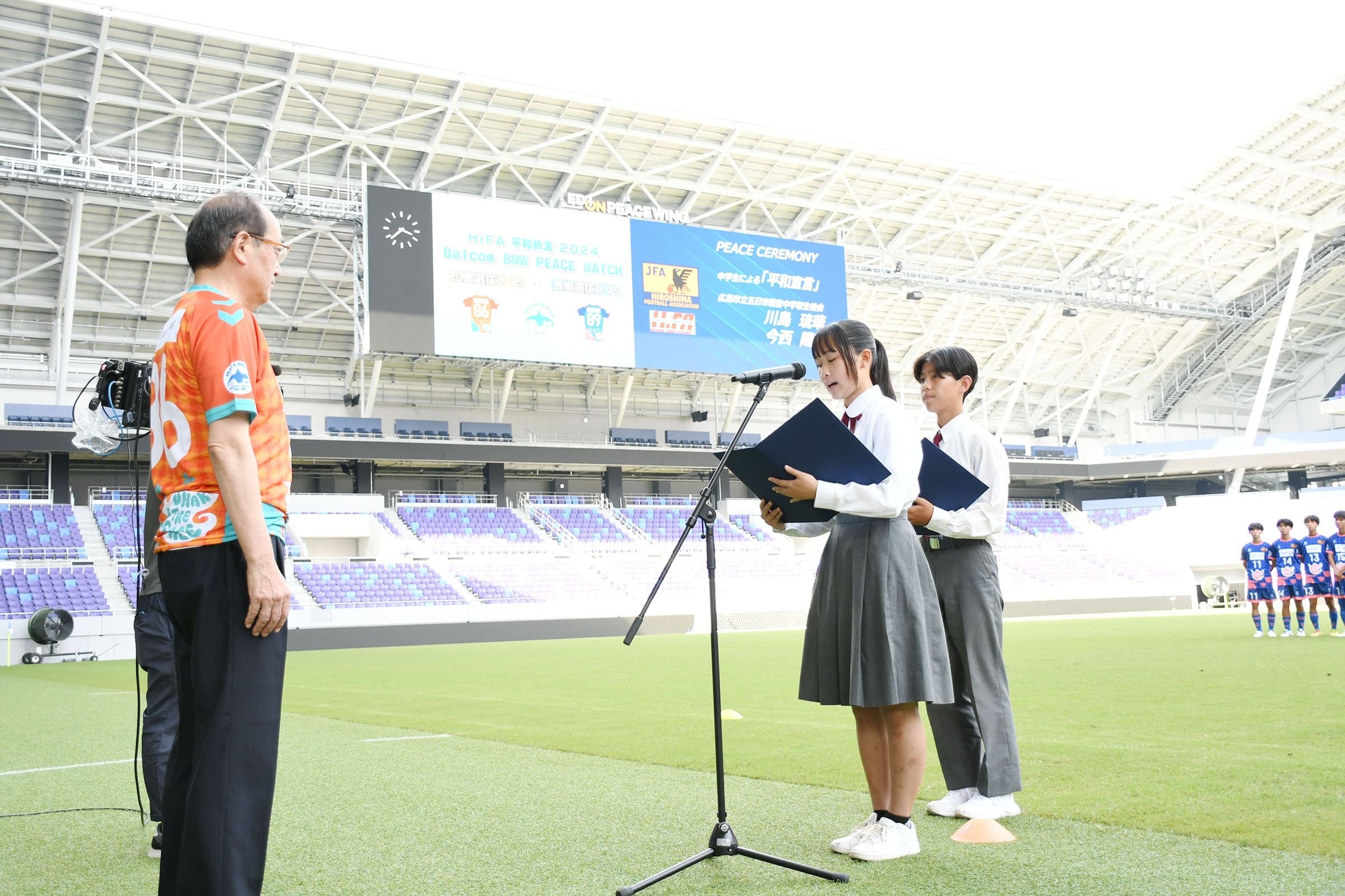 試合に先立って行われたピースセレモニーでは、広島市立五日市観音中学校の川島琉華さんと今西陽埜さんが、「中学生の私たちも、被爆者の声に耳を傾け、原子爆弾の悲惨さを次の世代に語り継いでいきます」とし、「このフィールドからすべての人々が『平和』を感じる喜びと、自由に夢を語れる世界を築くことを宣言します」と発表。