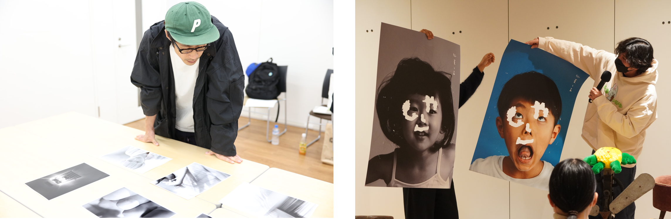 2023年に開催した「グラフィックデザインのパトス」の授業の様子。4名の講師が順番に課題を出して講評していくという流れで、4種類のテーマに取り組みました。全11回の授業の中で、9人の生徒が196点もの作品を制作しました。