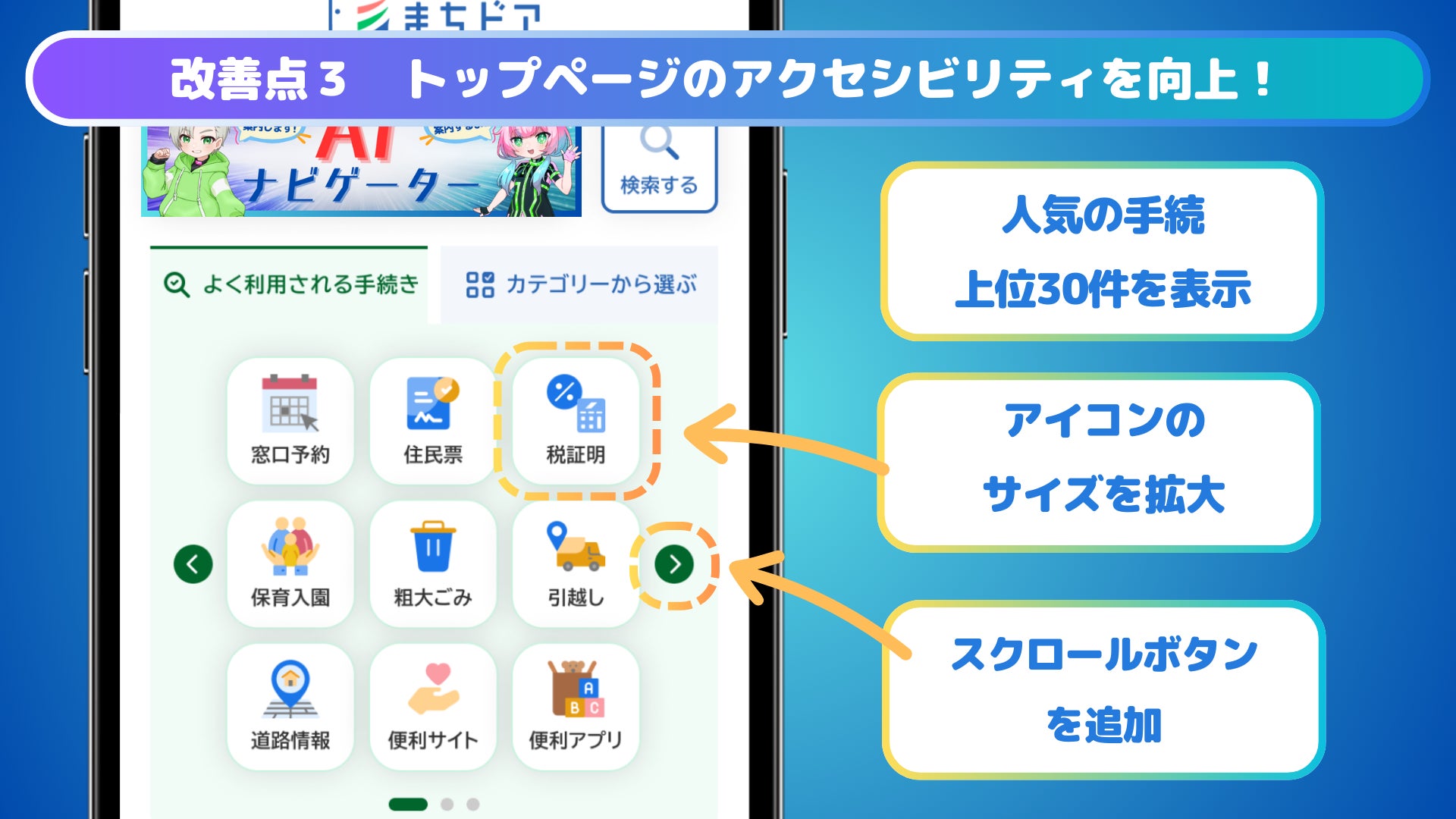 人気のデジタルサービスの表示数を、上位10件から30件に拡充し、ニーズの高い手続に、アクセスしやすくなりました。また、アイコンのサイズを拡大し、スクロールボタンを追加することで、より直感的に操作できるようになりました。