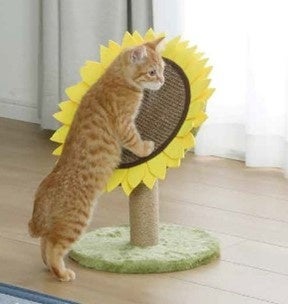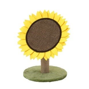 夏にぴったり、ヒマワリ型の爪とぎです。お花の中心部分と支柱部分が麻素材の爪とぎ、花びらはフェルト素材でできています。