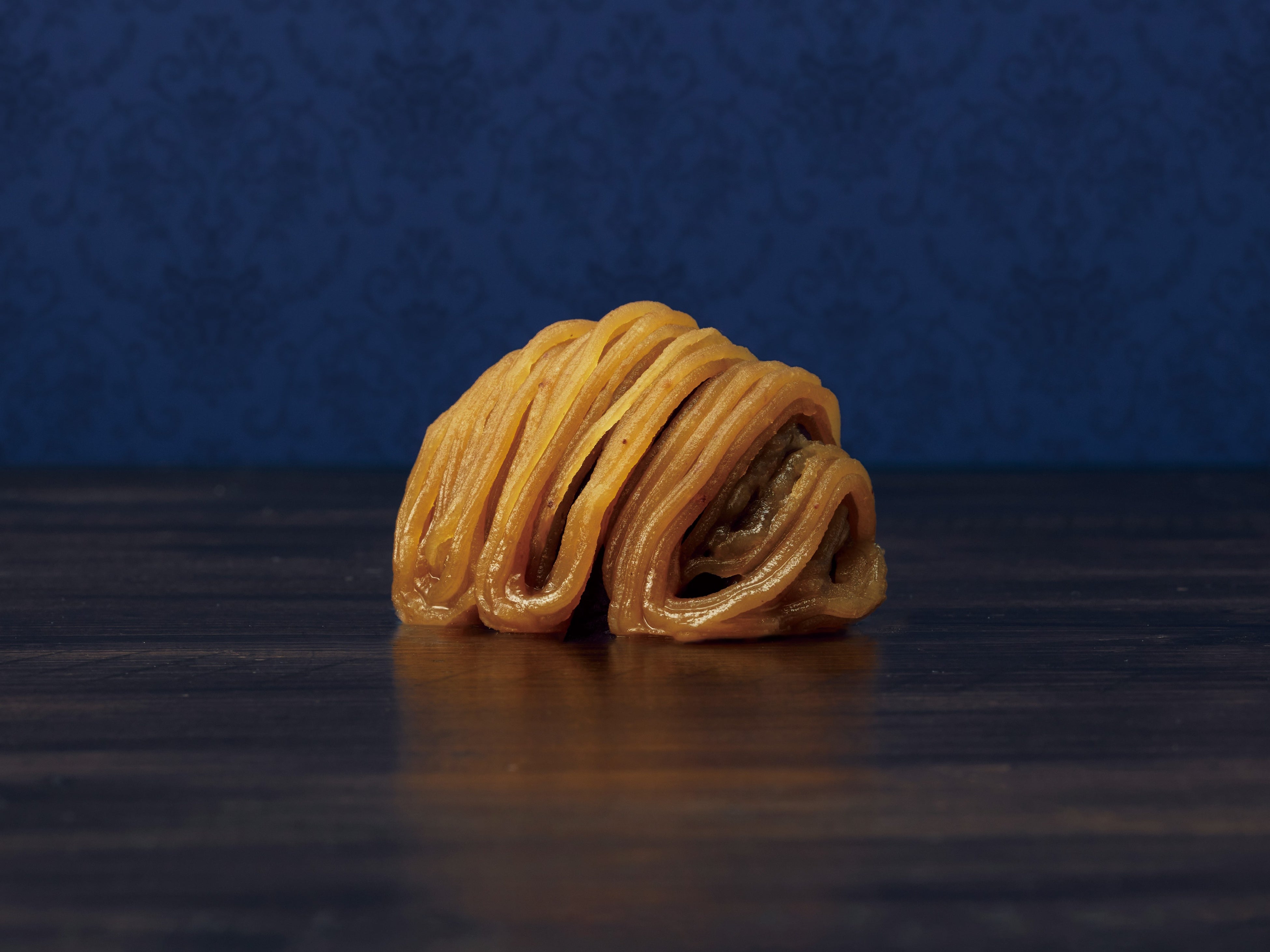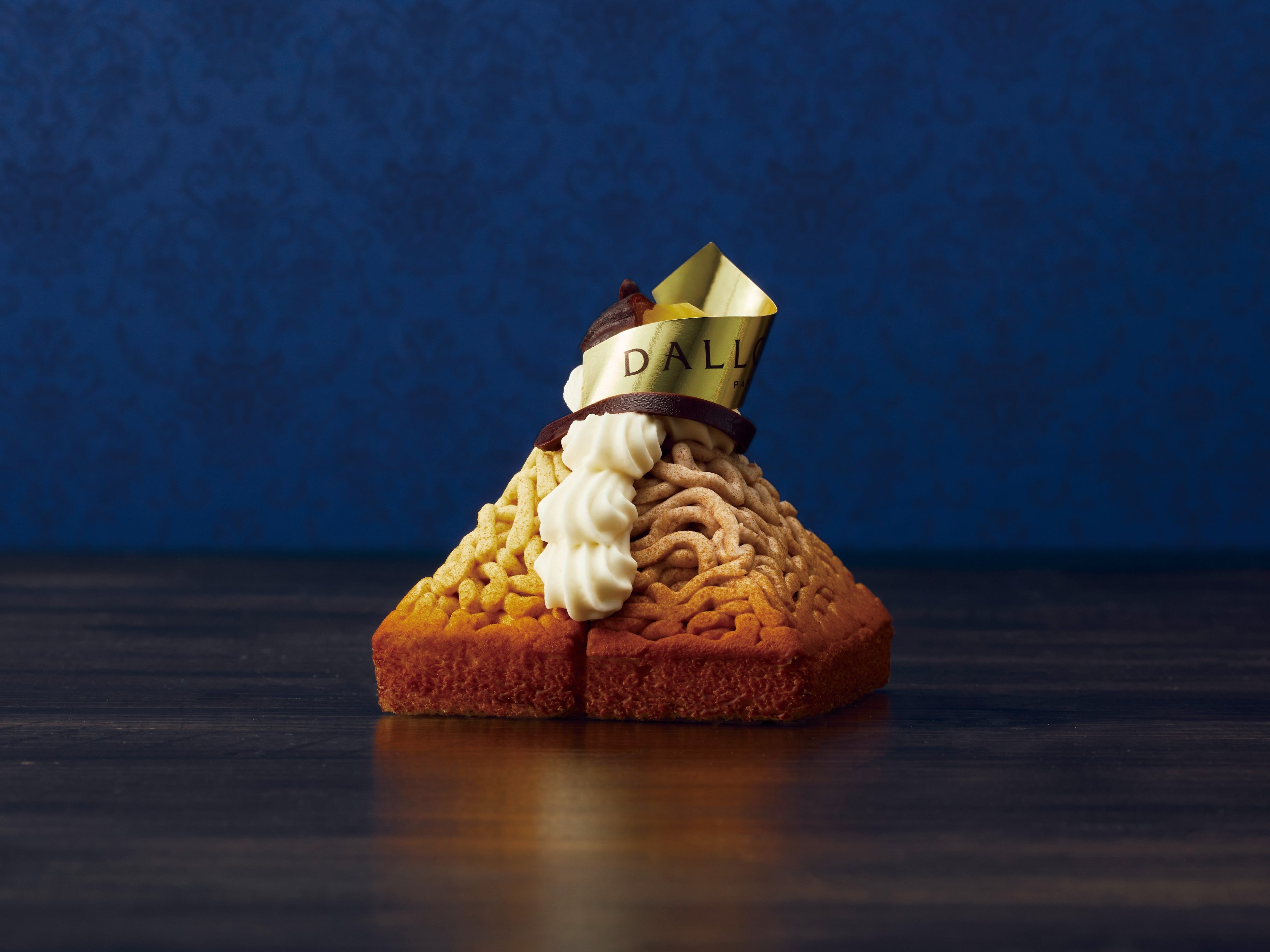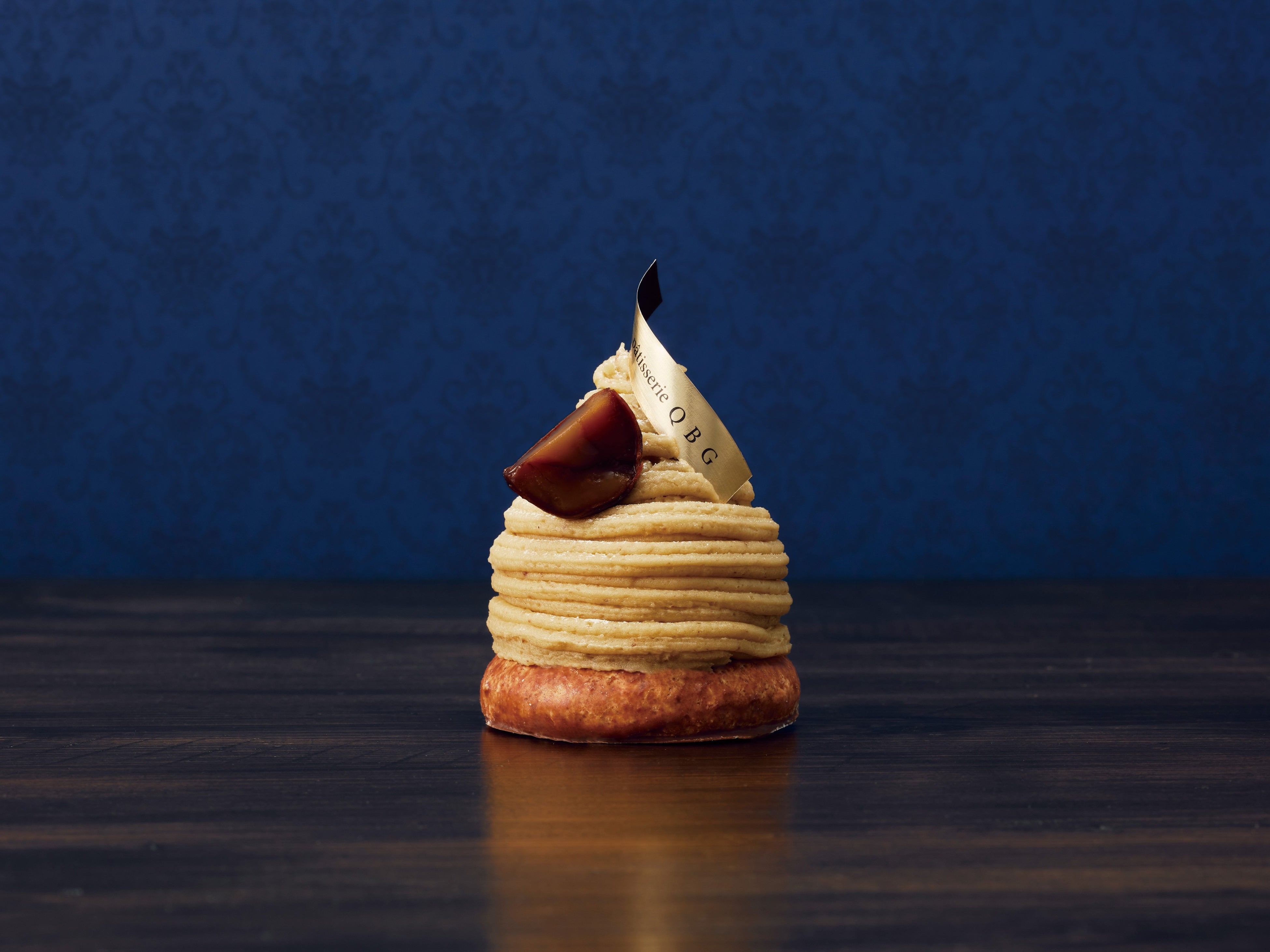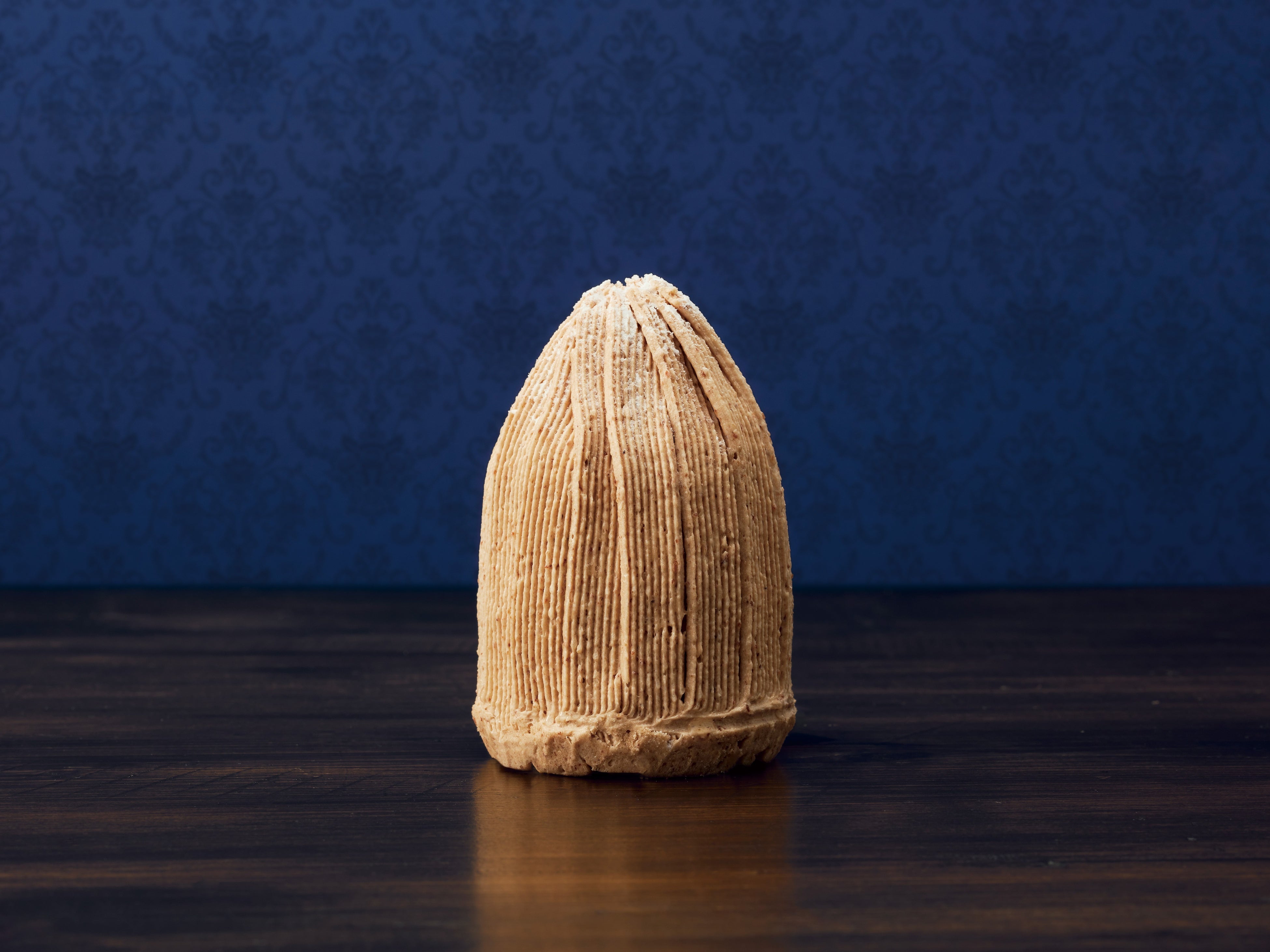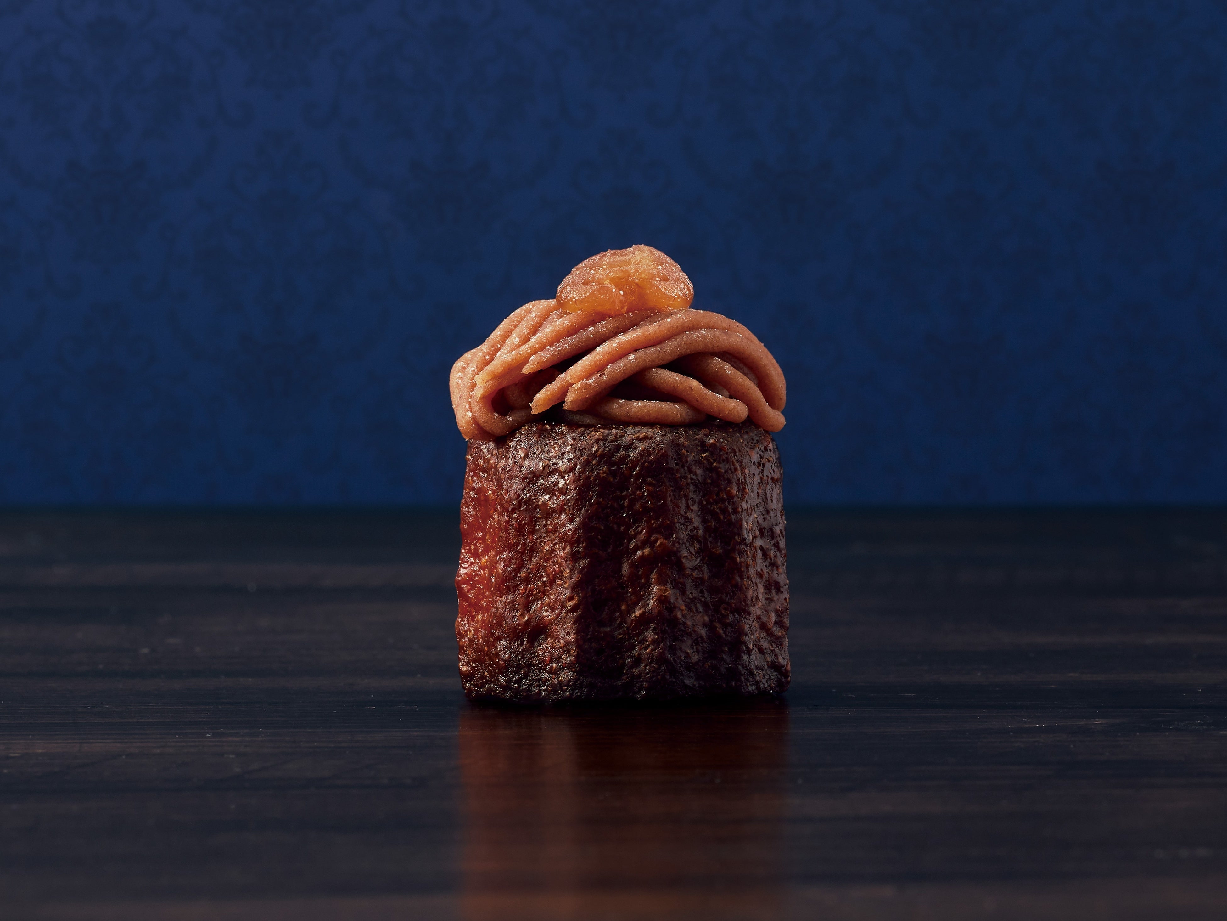 和栗を使ったモンブランをほんのりお酒を効かせたサバランへと仕立てました。香ばしく焼き上げラム酒とバニラのシロップを染み込ませたサバラン生地に、なめらかなプリン生地と口どけの良い生クリームを重ね、和栗のペーストを糸状に絞って仕上げた4層重ねのモンブラン。