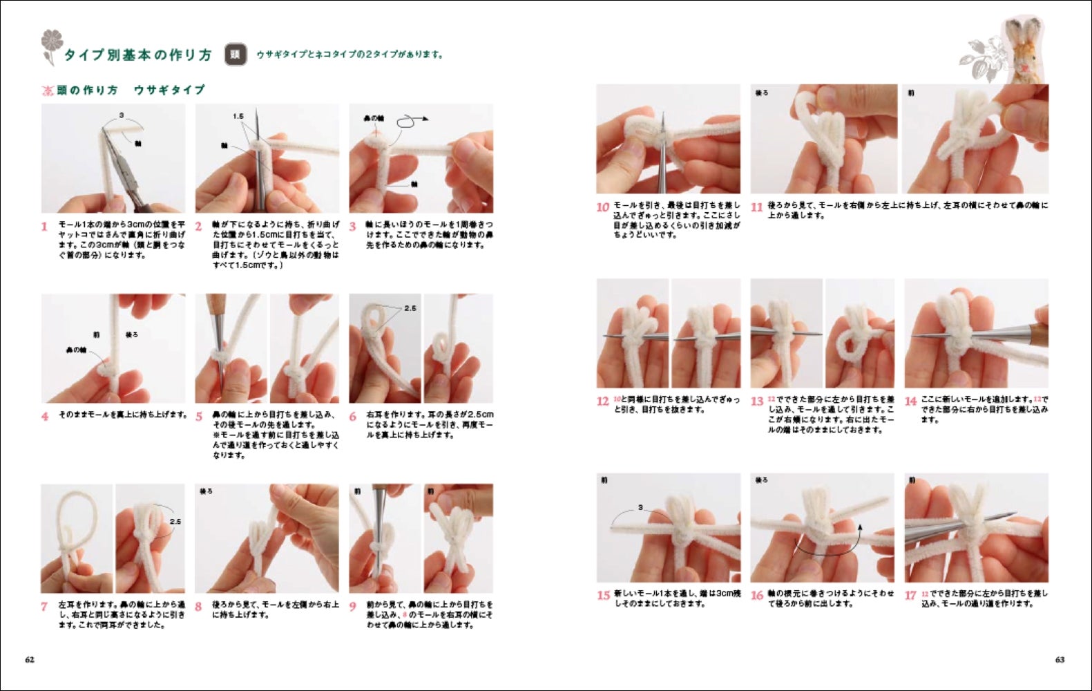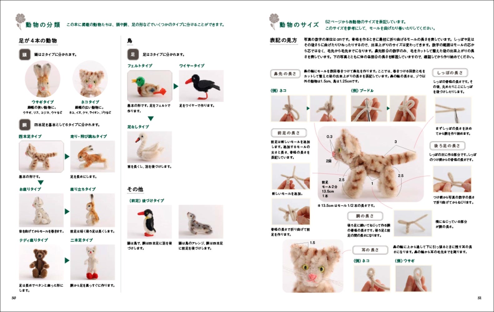「基本の作り方」から「アレンジ作品」まで、すべての工程を写真で解説しており、制作の基本となる形をもとに、耳や足、しっぽなどのアレンジを加えることで、さまざまな動物が作れます。