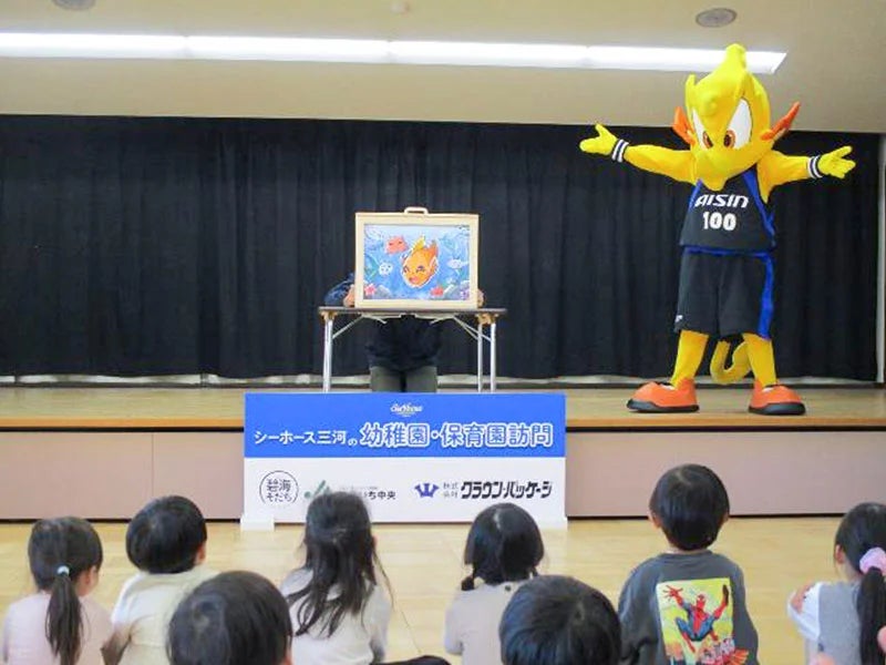 2024年11月7日(木)、シーホースくんとSuper GirlsのMISA、RIOが安城北部こども園(安城市)を訪問し、園児の皆さんと一緒にクイズやダンスを楽しみました。