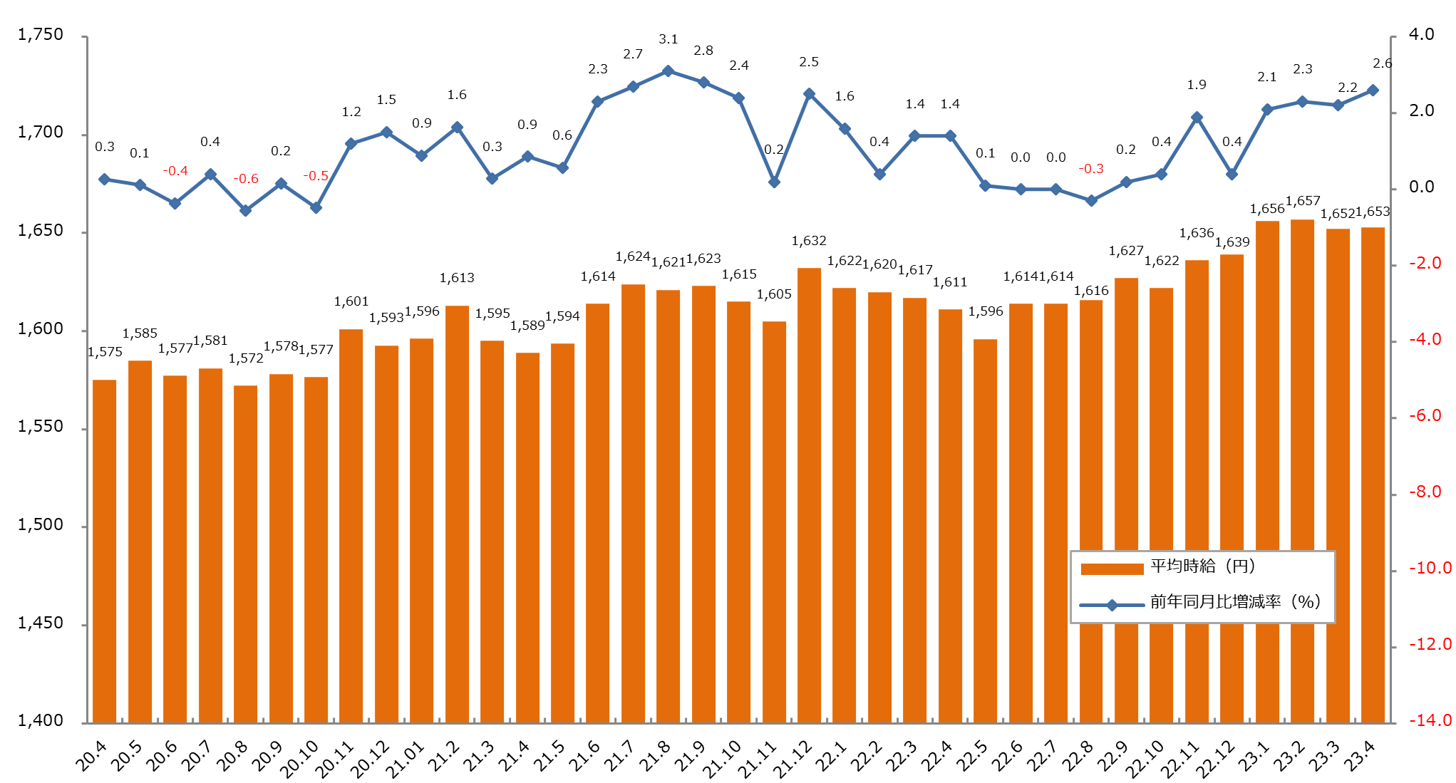 2023年4月度の三大都市圏平均時給は1,653円(前月比+1円・0.1%増、前年同月比+42円・2.6%増)。前月、前年同月ともに上回る結果になりました。平均時給の上昇には、コロナ収束に伴う人流の回復が影響しています。