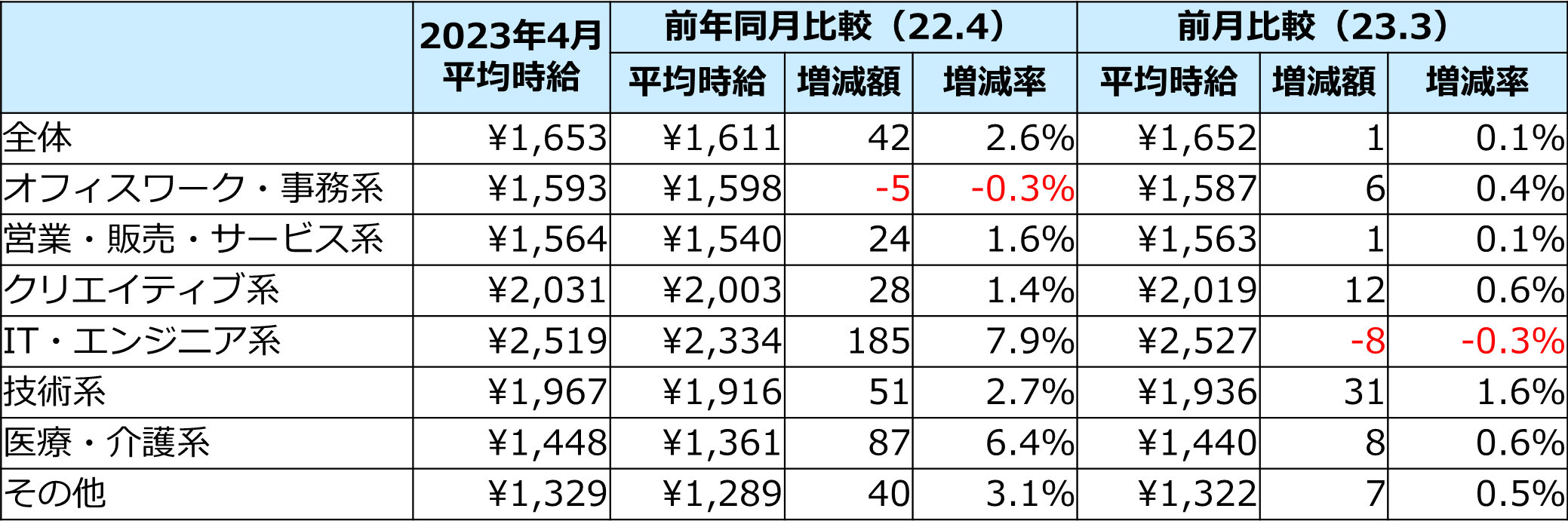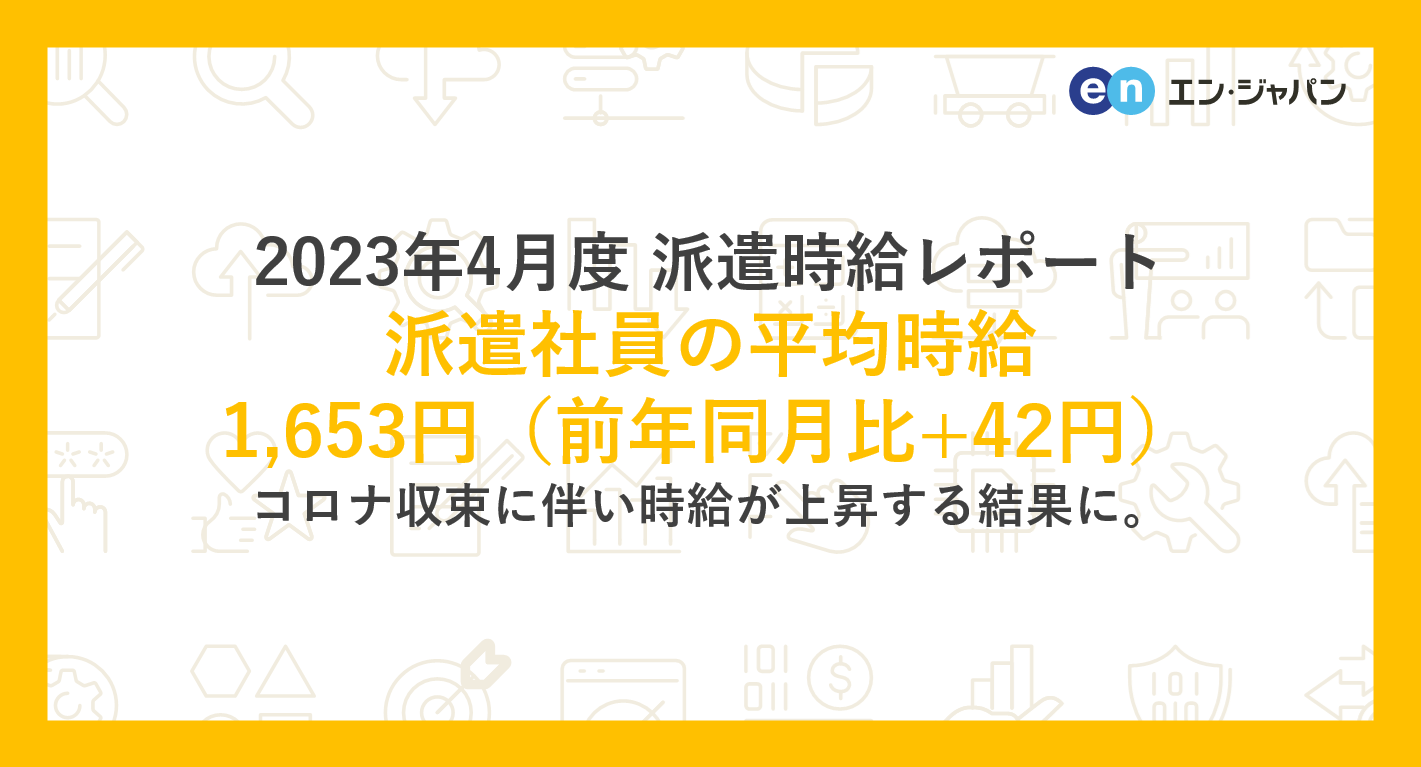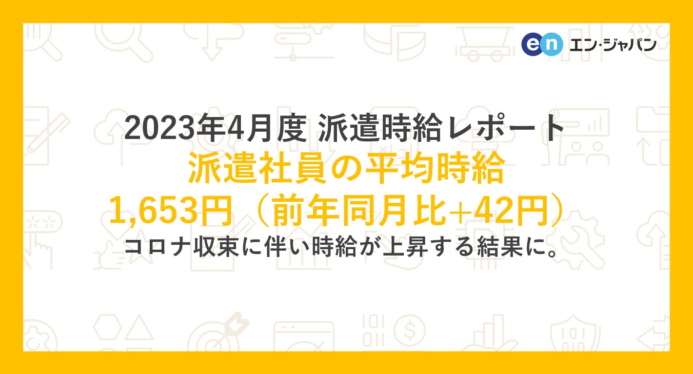 2023年4月度 派遣社員の平均時給は1,653円。コロナ収束に伴い、前年同月比+42円で時給額過去3位の高水準に。