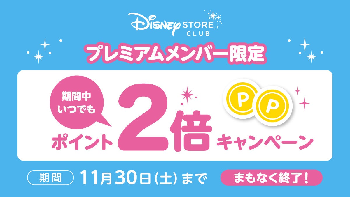 11月30日(土)までプレミアムメンバー(現:オフィシャルメンバー)限定で、お買い物時にポイントが2倍たまるキャンペーンを実施中です。いつもよりさらにお得に、ディズニーストアでのお買い物をお楽しみいただけます。