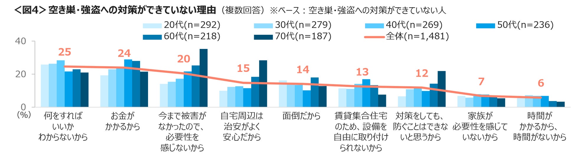 対策ができていない理由は、「何をすればいいかわからない」「お金がかかる」「今まで被害がなかったので、必要性を感じない」で20%台。狙われやすいとされる70代は「今まで被害がなかったので、必要性を感じない」「自宅周辺は治安がよく安心」「対策をしても、防ぐことはできないと思う」が他の年代に比べ目立って高い。<図4>