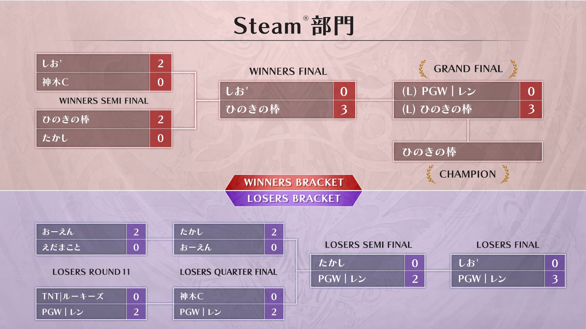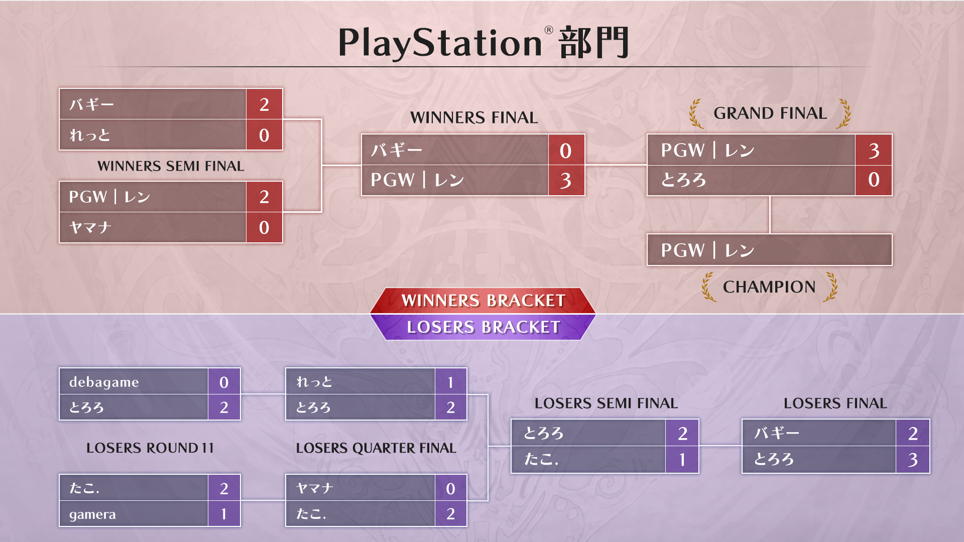 PlayStation®部門のGrand Finalは、2部門連続のGrand Final進出となったPGW | レン選手と、ルーザーズFinalをフルセットの末勝ち上がったとろろ選手との組み合わせに。この日通算9戦目となったPGW | レン選手が鬼気迫る試合運びでとろろ選手を打ち破り、遂に優勝を獲得。