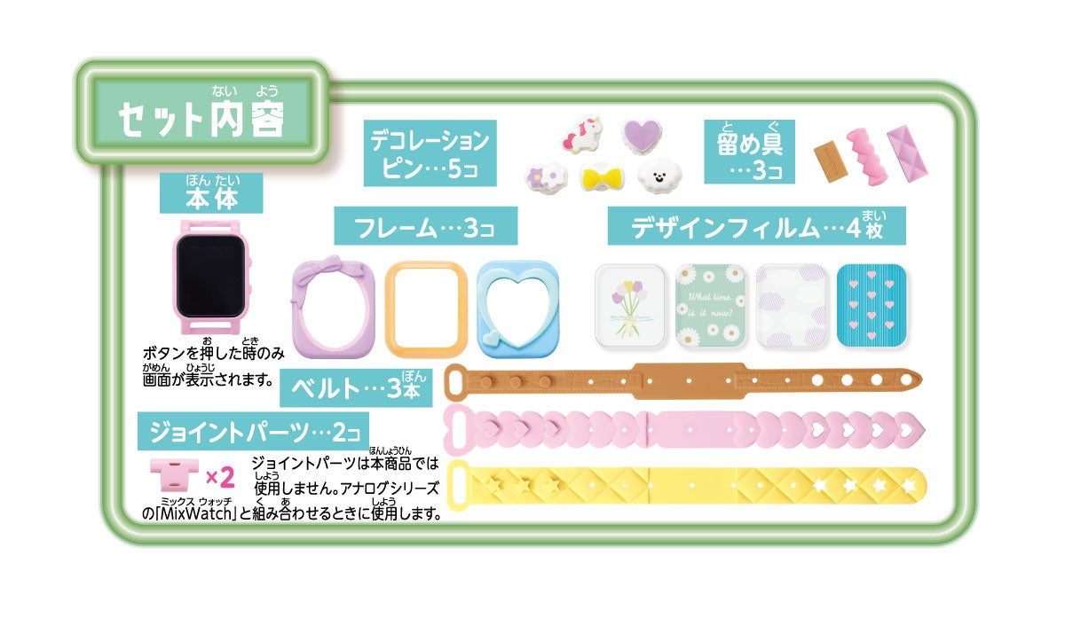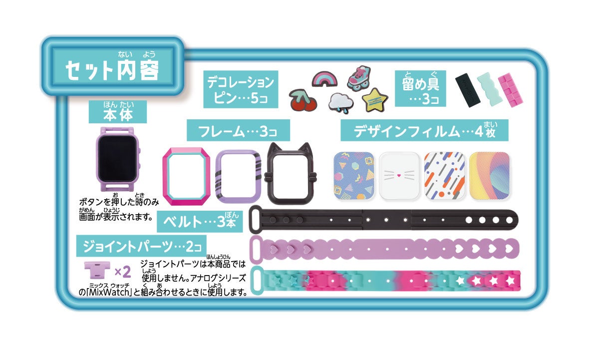 商品名 : MixWatchDigital(ミックスウォッチデジタル)セット内容 : ●本体…1個 ●フレーム…3個 ●ジョイントパーツ…2個 ●シリコンベルト…3本