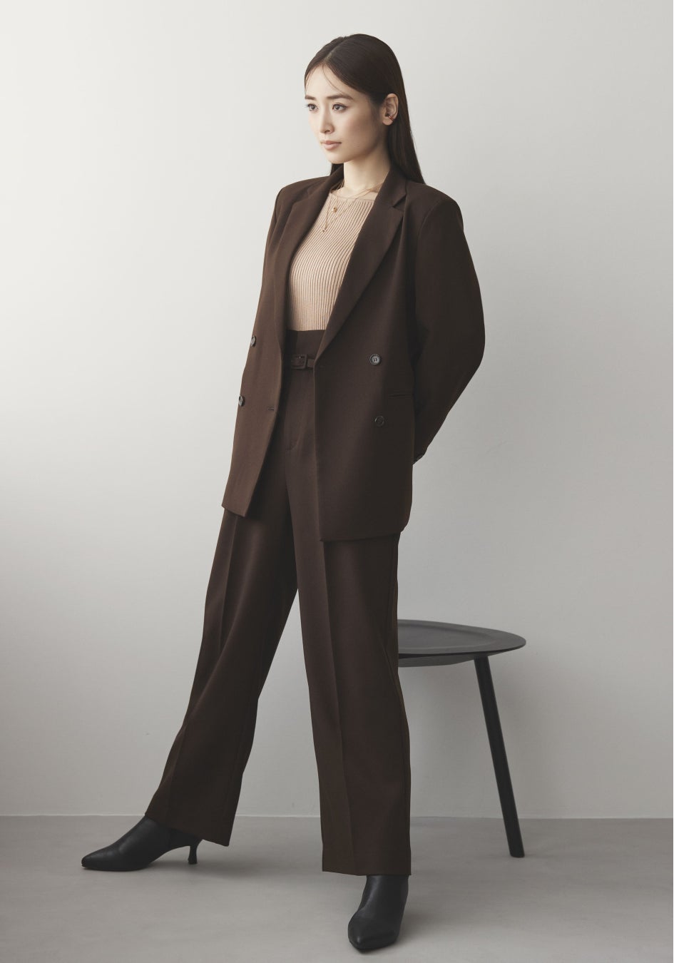 シルエットにこだわったジャケットと、同素材の細ベルトがついたワイドパンツはセットアップで着用することでハンサムなワークスタイルに。