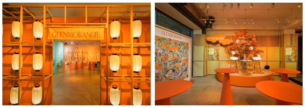 グレンモーレンジィの特徴であるオレンジ色の色彩を基調に、日本らしい暖簾や提灯、山口晃さんによるパッケージデザインの原画が展示され、「グレンモーレンジィ トーキョー」の世界観に包まれた会場。今回の限定商品の樽に使用した、ミズナラの木のオブジェがゲストを出迎えました。
