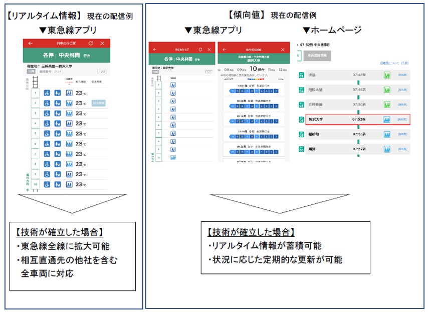 ・スマートフォン向けアプリ「東急線アプリ」の「列車走行位置」画面において、リアルタイム情報として混雑状況を配信していますが、応荷重データがリアルタイムで取得可能な一部路線の東急電鉄所属の一部車両のみ(※)となっており、その他の画面、およびホームページにおいては過去データを分析したものを傾向値として配信しています。