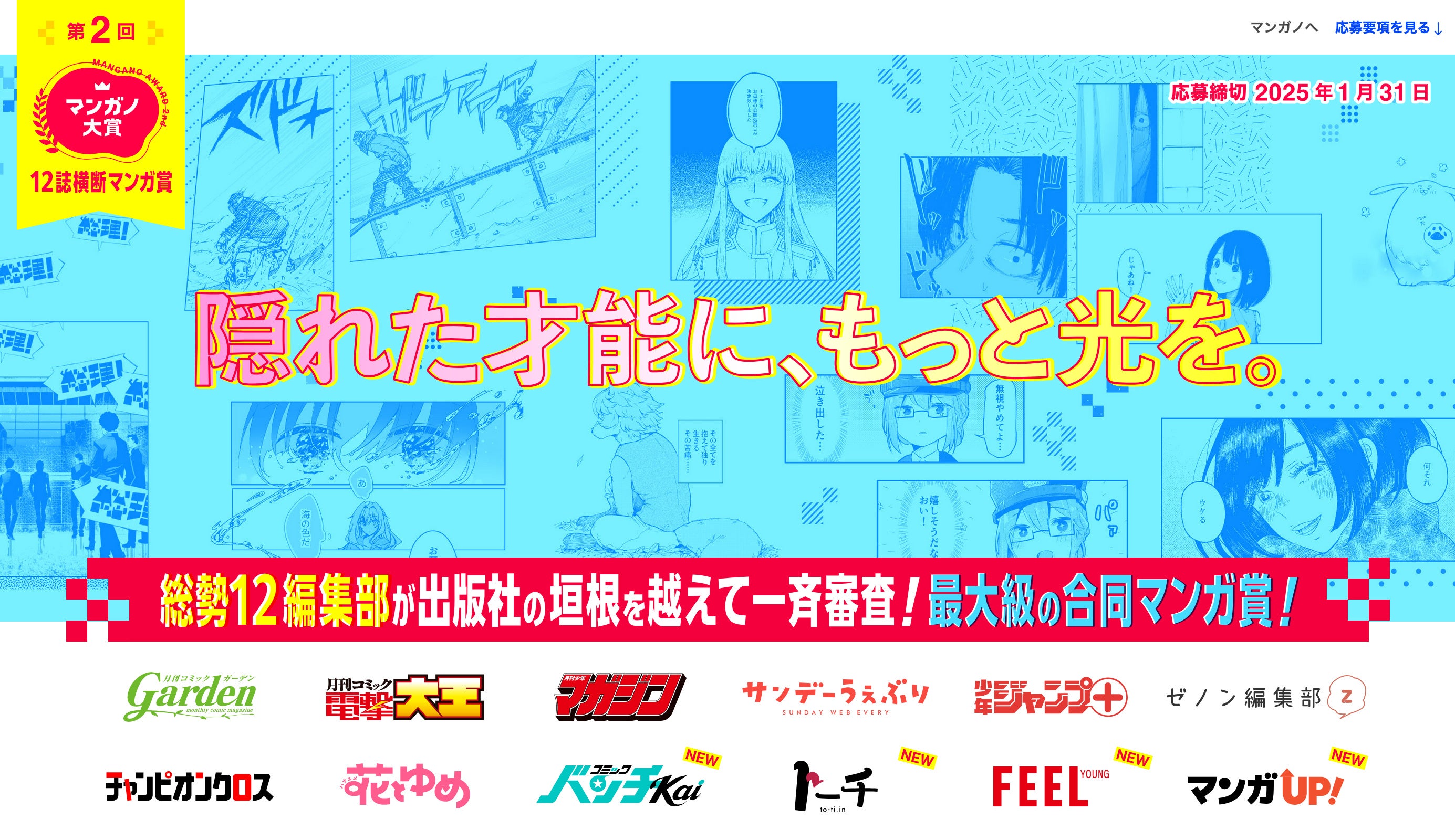マンガ投稿プラットフォーム「マンガノ」にて、出版社や編集部の垣根を越えて、12社12編集部が参加する国内最大級の合同マンガ賞「第2回マンガノ大賞」を開催。