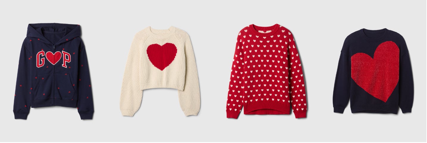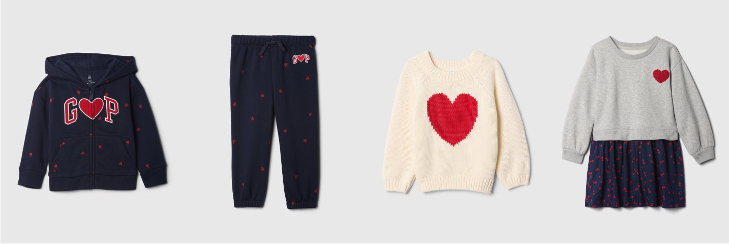 左から) babyGap リラックス GAPロゴ バレンタイン ジップアップパーカー ¥4,990、babyGap リラックス GAPロゴ プルオンジョガーパンツ ¥3,990、babyGap ハート チャンキーセーター ¥5,990、babyGap 2in1 ヴィンテージソフト スウェットワンピース ¥5,990