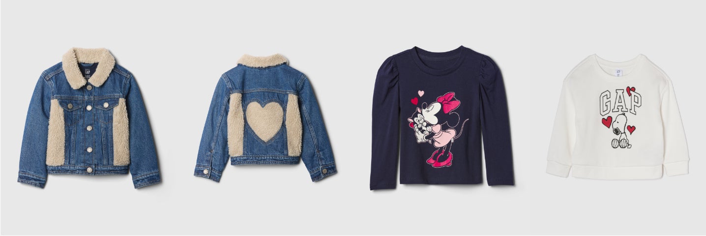ハートをモチーフにしたGAPロゴスウェットやセーターの他、ディズニー、スヌーピーとのコラボレーションアイテムもラインナップ