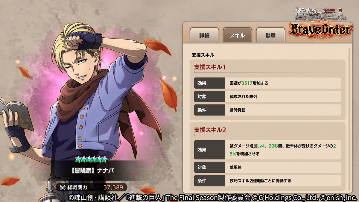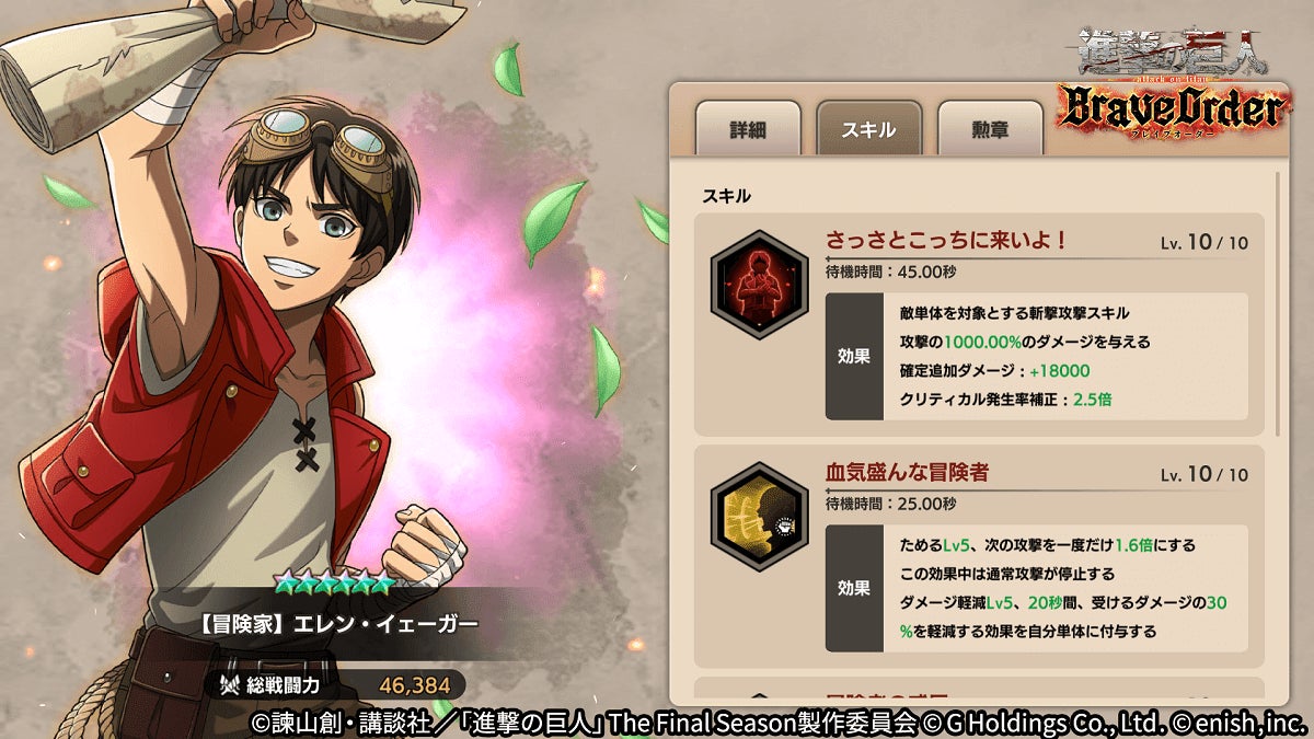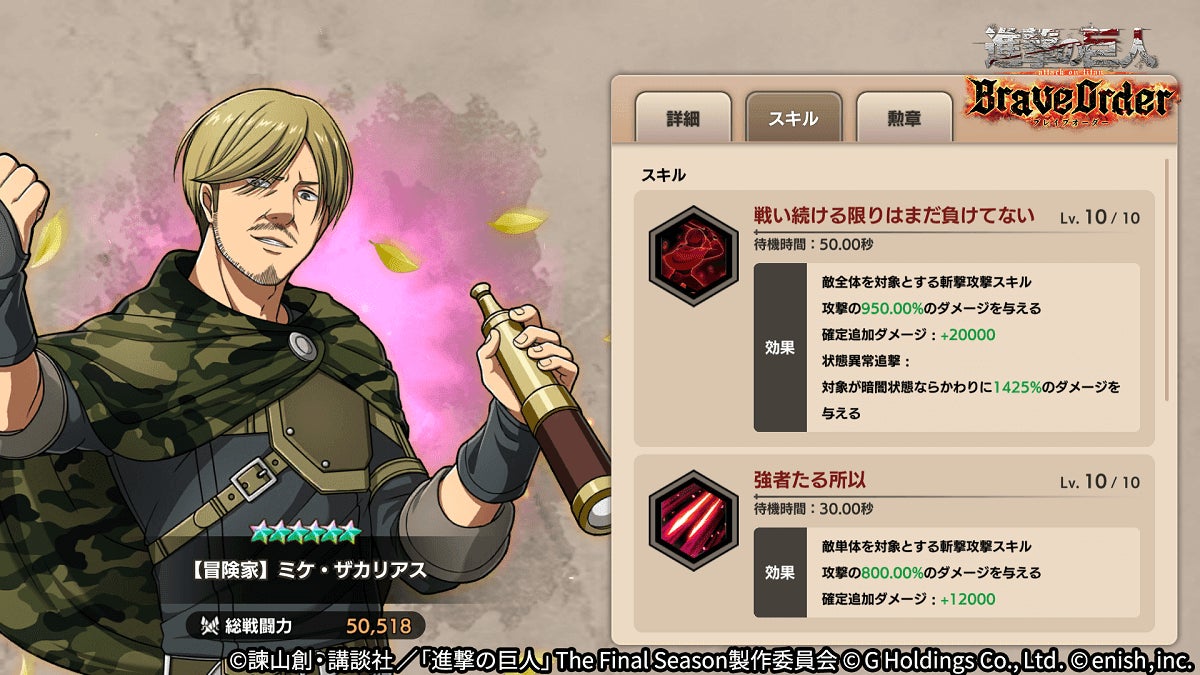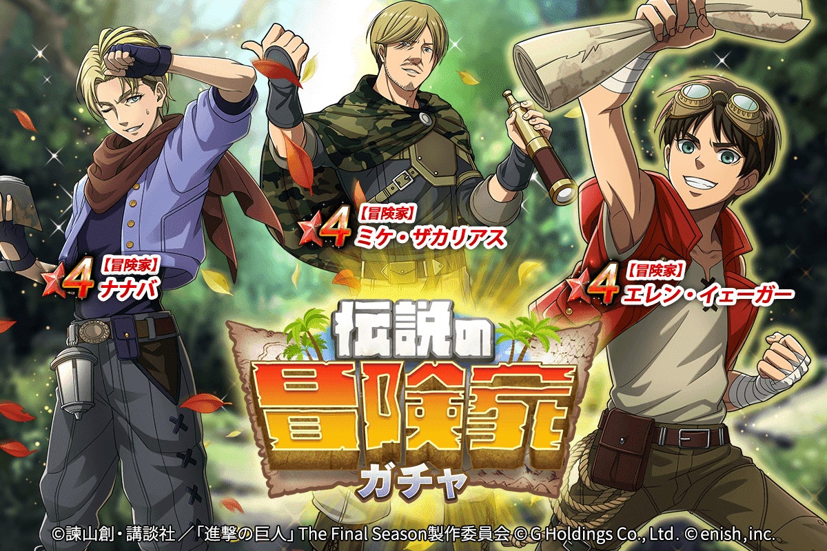 株式会社enish(本社:東京都港区、代表取締役社長:安徳 孝平、以下enish)は、アニメ『進撃の巨人』のスマートフォンゲーム最新作「進撃の巨人Brave Order」にて、10月31日(月)より新イベント「伝説の冒険家」を開催!イベントアイテムを集めて限定の「ライナーの衣装」を手に入れよう!また、本日より新登場の【冒険家】エレン・イェーガー、【冒険家】ミケ・ザカリアス、【冒険家】ナナバがピックアップされた「伝説の冒険家ガチャ」も同時開催!その他、最新情報はゲーム公式サイト・ゲーム公式Twitterアカウントにて随時公開して行きますので、ぜひご覧ください。