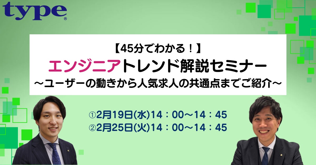 転職サイト「type・女の転職type」では、2/19(水)、2/25(火)14時より、「【45分でわかる!】エンジニアトレンド解説セミナー~ユーザーの動きから人気求人の共通点までご紹介~」を開催いたします。