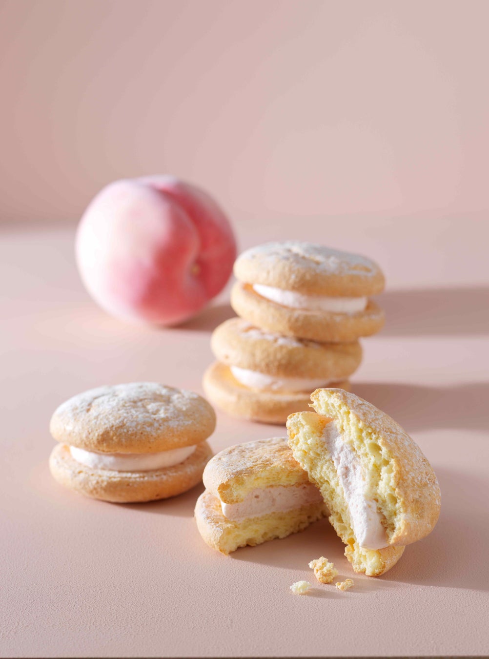 マスカルポーネチーズと桃、アーモンドプードルが入ったやわらかいブッセ生地に、さわやかな桃味のペッシュバターチーズクリームを絞りました。