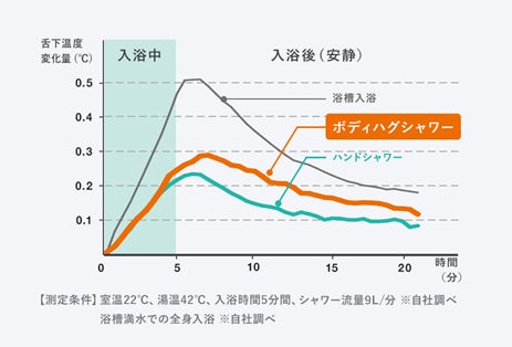 5分入浴後、ボディハグシャワーはハンドシャワーと比べて深部体温が下がりにくいと言えます。