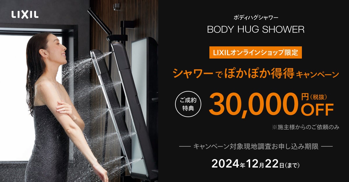 内容:対象期間中、LIXILオンラインショップよりボディハグシャワーの「現地調査依頼」をお申込みいただいた方に、成約時に設置工事費から30,000円(税抜き)をお値引き