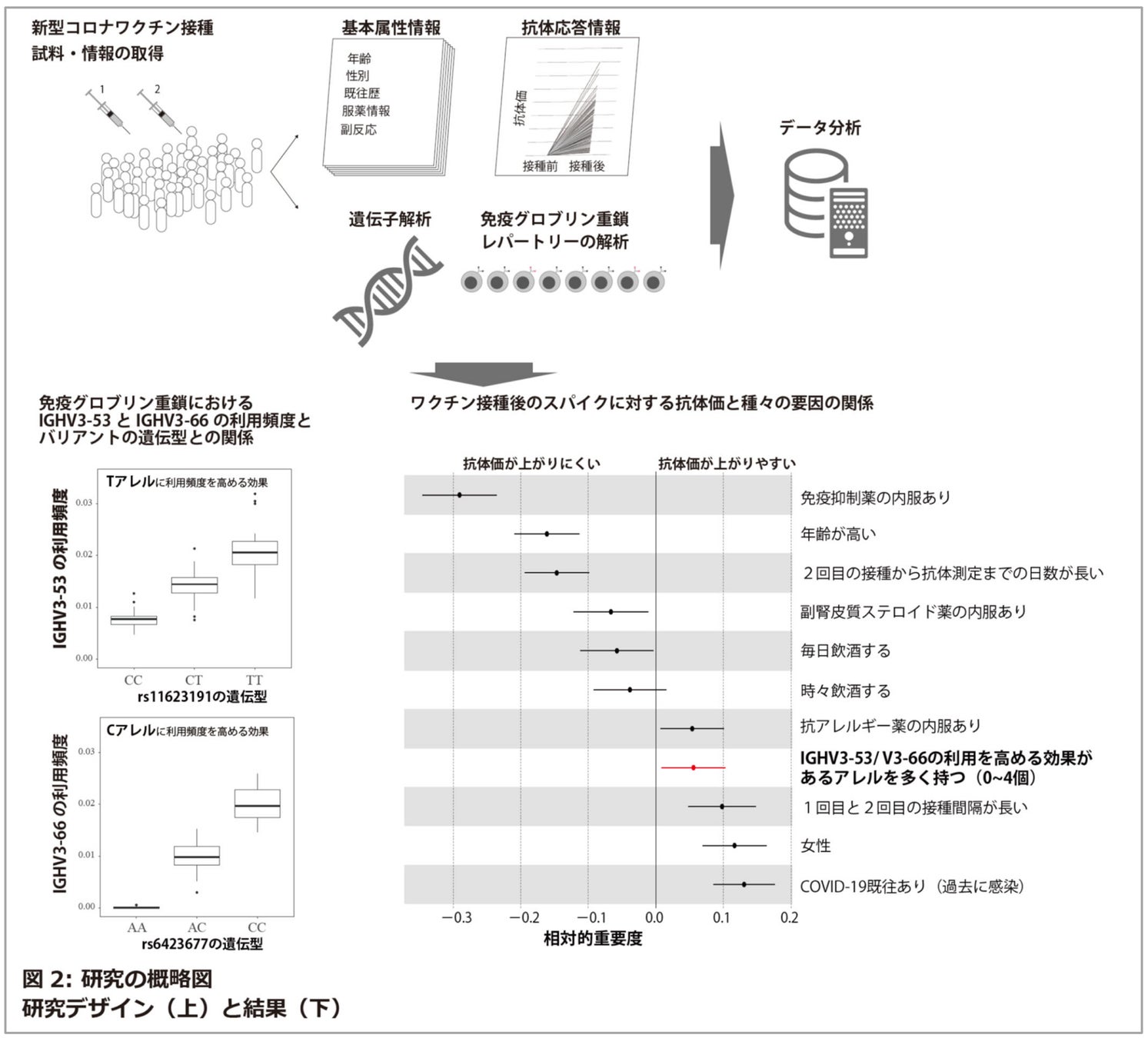 新型コロナウイルスに対する中和抗体をその遺伝子に注目して調べた海外の先行研究で、IGHV3-53とIGHV3-66が特に重要で、中和抗体の設計図としてよく使われていることが知られていました。千葉大学医学部附属病院コロナワクチンセンターではこれら2つの遺伝子に注目し、新型コロナワクチン(ファイザー社 BNT162b2)の接種を受けた職員を対象に、研究を行いました(図2上)。
