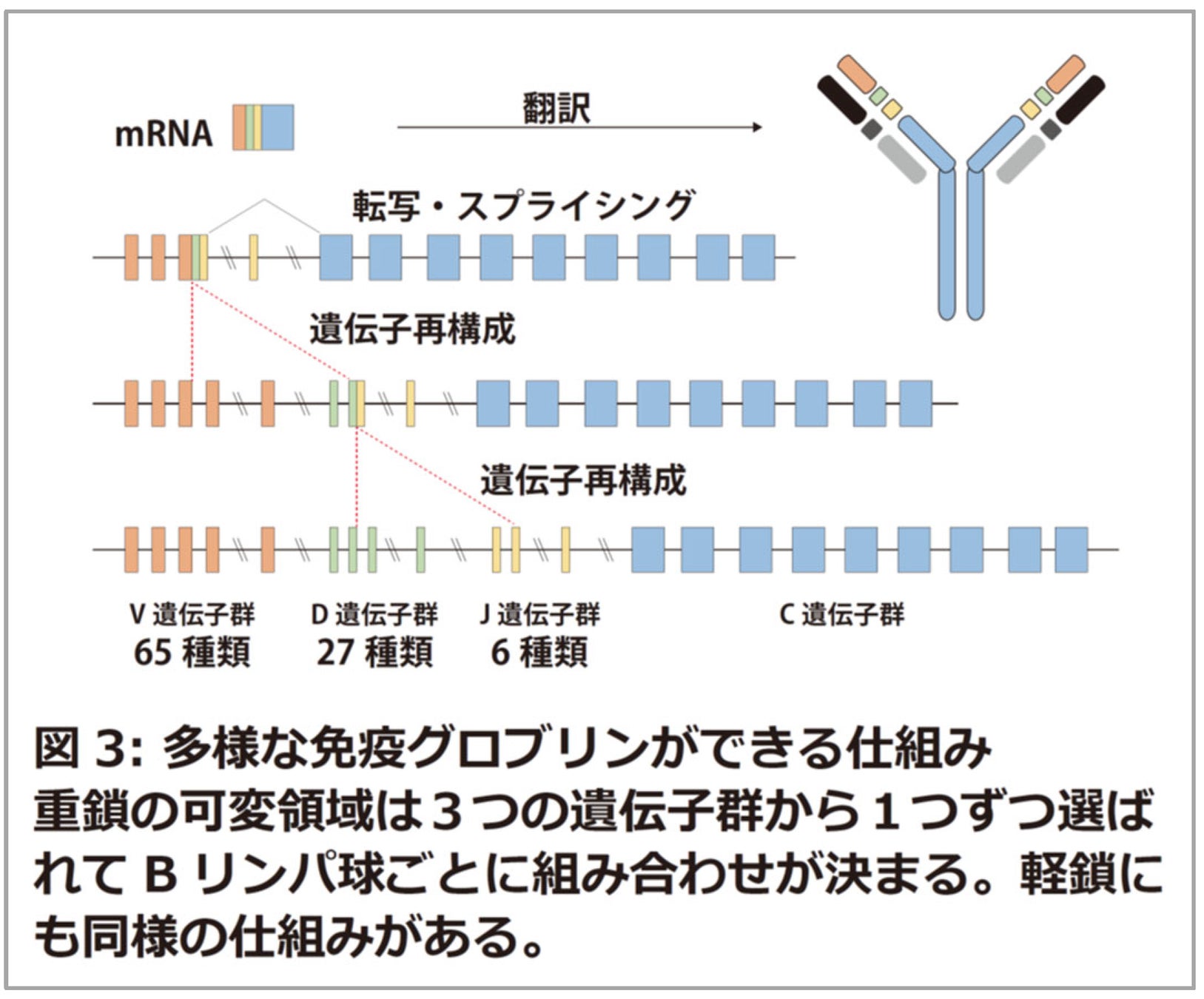 (注2)Bリンパ球のレパートリー: 免疫グロブリンは軽鎖と重鎖からなり、それぞれ異なる遺伝子(設計図)で作られる。抗原と結合する部分(可変領域)はいくつかの部品(軽鎖は2,重鎖は3)に分かれており、Bリンパ球がもととなる細胞(造血幹細胞)からできてくる過程で、軽鎖、重鎖それぞれについて多くの候補から選ばれた一つの組み合わせが決まる(図3)。そのため一つのBリンパ球が作る抗体が結合できる抗原の種類は限られるが、部品の組み合わせ、軽鎖、重鎖の組み合わせのパターンが異なる極めて多様なBリンパ球が出来ることで、様々な抗原に対応して抗体を作れるようになっている。IGHV3-53, IGHV3-66はいずれも重鎖の可変領域の部品(図中のV遺伝子)である。