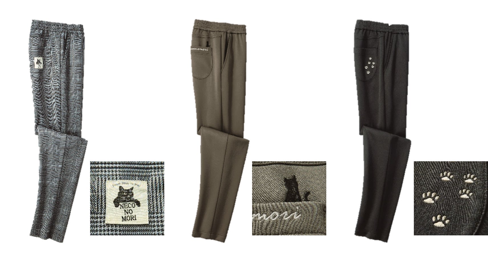 特長 :毎日使いやすい裏起毛パンツです。よく伸びて快適な着心地ながら、スッキリとしたシルエットを実現。ポケットには、さりげないアクセントとしてかわいい猫のモチーフをあしらいました。3色ともそれぞれデザインが異なり、コーディネートの楽しみも広がります。