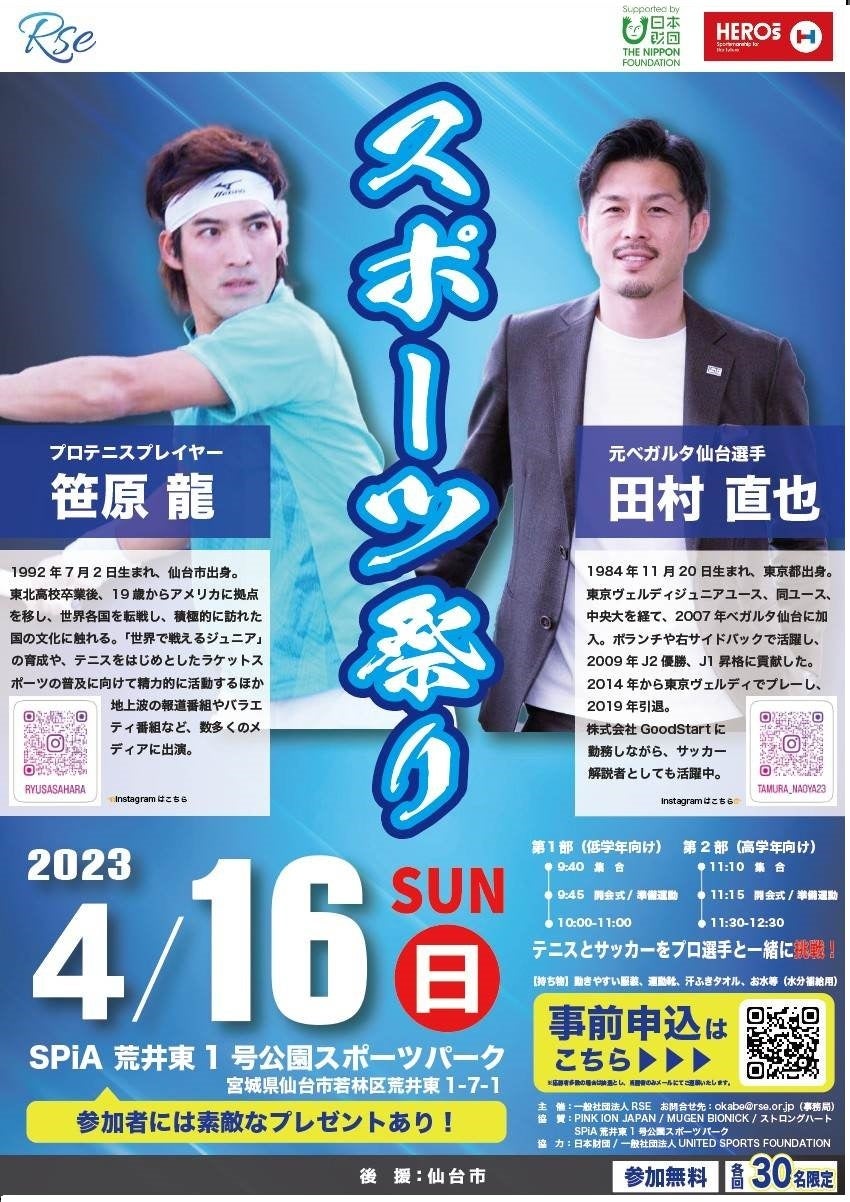 さらに4月16日(日)にスポーツ祭りが開催されます。笹原選手は、元ベガルタ仙台選手で、現在は株式会社GoodStartに所属しながら、サッカー解説者としても活躍中の田村直也選手と共に、テニス選手とサッカー選手が一緒にスポーツに触れ合いイベントを実施する予定です。本イベントは、スポーツを通じて地域とのつながりを深め、子どもたちに夢や希望を与えることを目的としています。