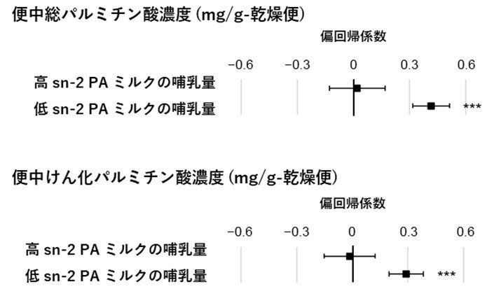 低sn-2ミルクの授乳が増えると便中総PA、けん化PAレベルが増加する一方で、高sn-2 ミルクの授乳量が増えても便中の総PA、けん化PAレベルは増加しないことが示された。