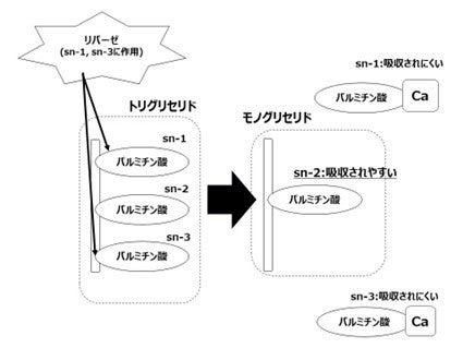 図1:トリグリセリドの脂肪酸結合部位とパルミチン酸の消化・吸収