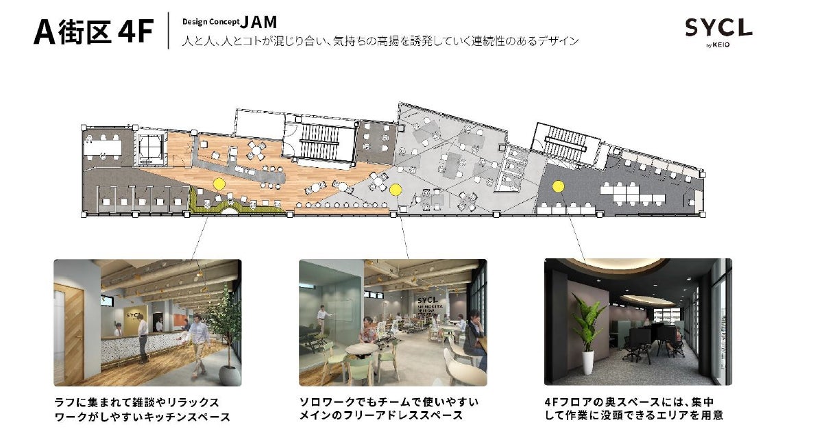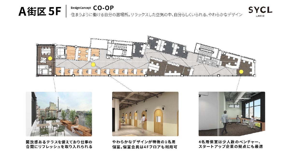 1名から利用可能なコワーキングスペースに、1~4人用の個室ブース、最大30坪のオフィス区画を備え、個人、フリーランスからスタートアップ・ベンチャー企業の拠点、大手企業のサテライト拠点まで、様々なニーズに対応します。また、入居メンバー同士、「SYCL by KEIO」に閉じず、入居メンバーと地域のプレイヤーをつなげる取り組みも推進していきます。