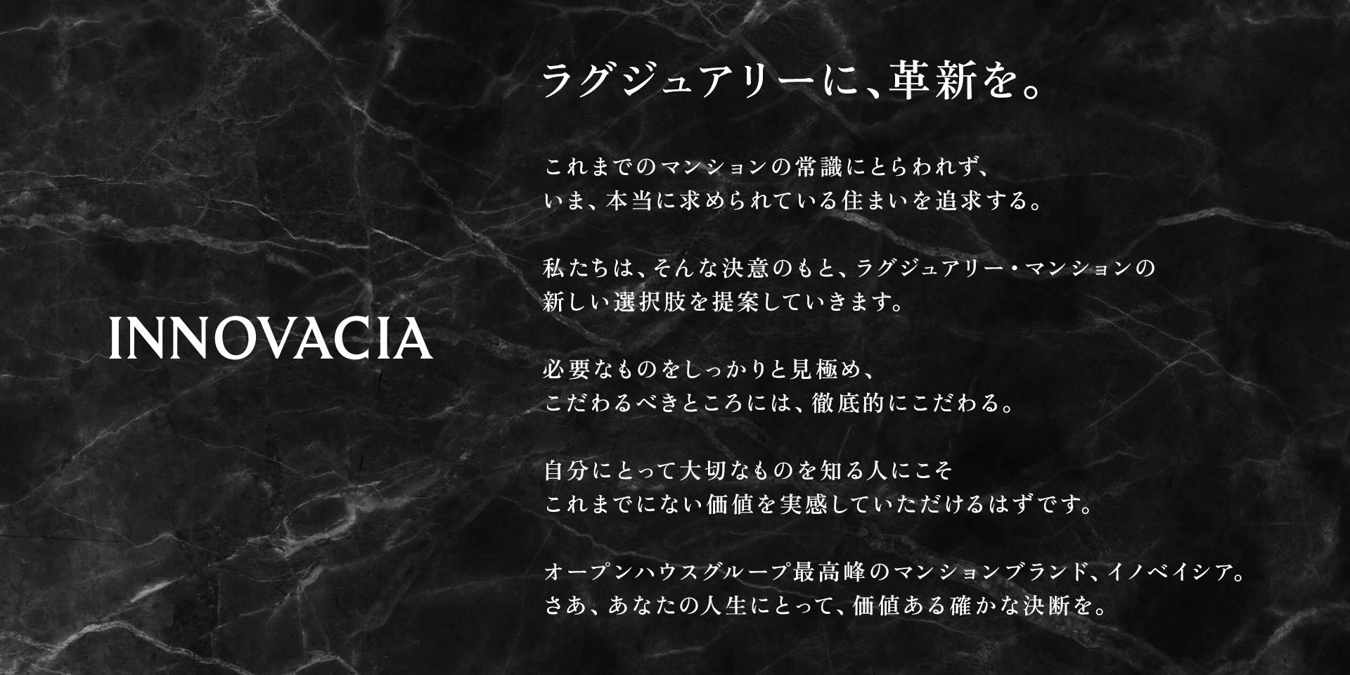 株式会社オープンハウスグループ(本社 東京都千代田区、代表取締役社長 荒井正昭)は、2024年11月22日、これまで数々の不動産業界の既成概念を打ち破り、真のお客様のニーズを追究し続けてきたマンション事業部から、「革新-INNOVATION-」をテーマとする2つの新しいマンションブランドを発表いたします。住まいの常識を変えてきたオープンハウスグループならでは、現代の多様な価値観を映し、挑戦者がまだ見ぬ世界で自分だけのラグジュアリーにこだわる「INNOVACIA」(イノベイシア)、そして、本当に欲しいライフスタイルの理想を合理的に叶える「INNOVAS」(イノバス)が誕生します。