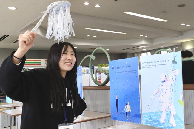 高校生に写真を撮ってもらい、SNSなどで拡散していただけるように、アルミホイルや段ボールなどの身近な素材を使い、シャワーヘッドなどの小物を手作りし、「写真映え」する展示へアップデート!学生の創意工夫で、展示の体験性と楽しさを高めただけではなく、よりリアルで共感性の高い展示内容を実現しました。また、会場でしか体験できない仕掛けを導入したことで、参加意欲と満足度の向上を図りました。