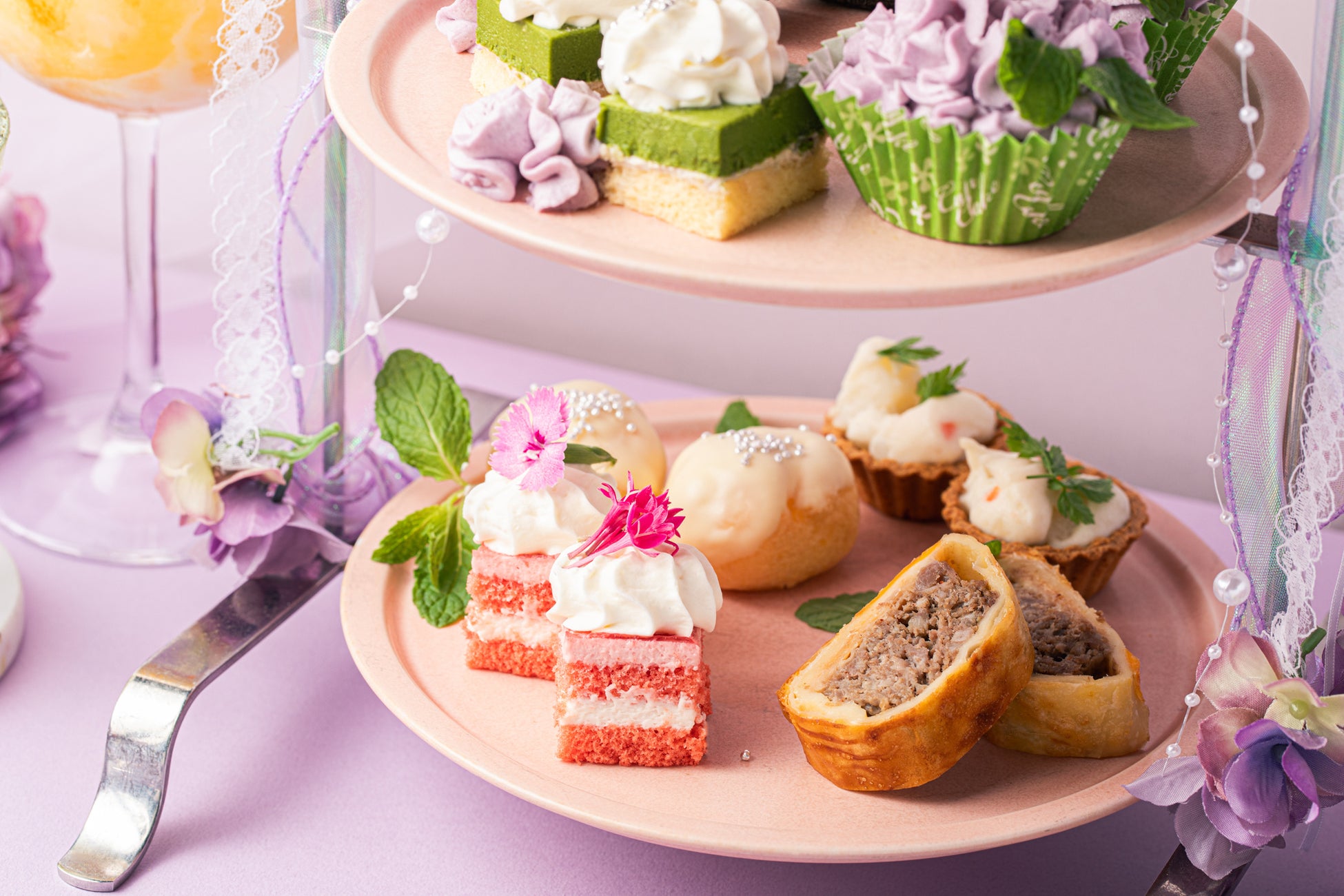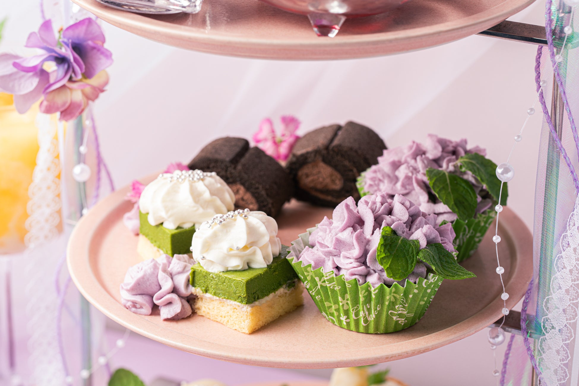 紫芋をベースにした紫陽花カップケーキやプリン、ぶどうのトライフルや抹茶のムースケーキなど、スイーツとセイボリー全10種が楽しめる。