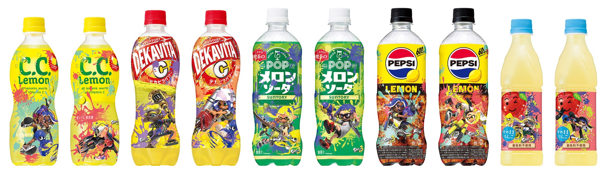 スプラトゥーン3とコラボレーションした「塗られちゃったボトル」を「C.C.レモン 500ml」(2種)、「デカビタパワー 500ml」(2種)、「POP メロンソーダ 600ml」(2種)、「ペプシ〈生〉 BIG ZERO LEMON 420ml」(2種)、「なっちゃん りんご 425ml」(2種)の全10種で展開します。