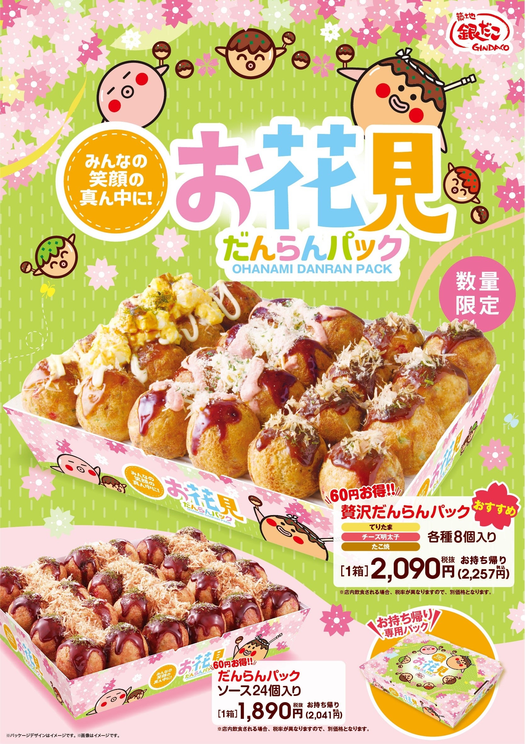 「だんらんパック」 はお持ち帰り専用商品としてご用意しており、『お花見だんらんパック』 は、1番人気の「ぜったいうまい‼たこ焼(ソース)」のみでご提供。『お花見贅沢だんらんパック』は、「ぜったいうまい‼たこ焼(ソース)」 に加え、定番商品の 「てりたま」 と 「チーズ明太子」 の3種類をお楽しみいただけます。いずれも単品でのご購入と比べて “60円” お得なセット価格でご提供いたします。