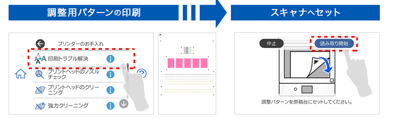 お手入れメニューから調整パターンを1枚印刷して、スキャナーに読み込ませるだけで、今までお客様が目視で行っていた画質調整をプリンターが自動で実施。ノズル抜けや横スジ、ぼやけなどの印字トラブル解決が簡単になりました。