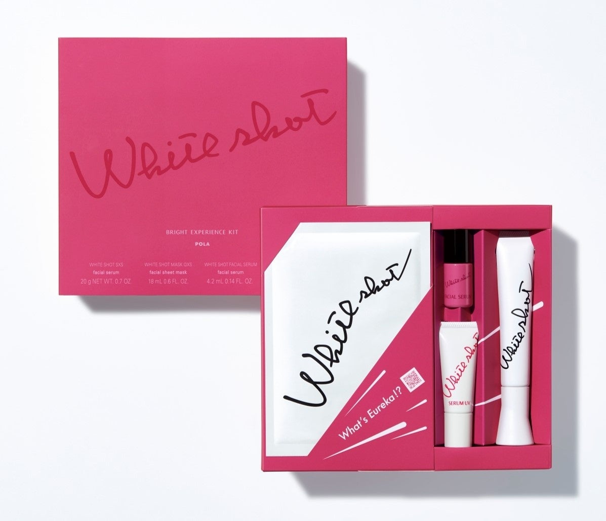 「ホワイトショット」は、常識にとらわれない想定外の着眼点による研究を続け、独自の視点で新時代を切り開きたいというブランド姿勢を掲げています。『ホワイトショット SXS ブライトエクスペリエンスキット』は、進化し続ける「ホワイトショット」のスターアイテムを揃えた数量限定のキットです。紫外線が増える季節でも前向きな気持ちでいきいきとした毎日を過ごしていただけることを目指しています。こちらのキットでお試しいただけるアイテムは、ルシノール®※3がシミの発生源※4に届き、しつこいシミ※5を防ぐ、シミができたら困るところに集中的に使いやすい濃厚※6な集中※7美容液『ホワイトショット SXS』と、顔全体に使いやすいみずみずしいテクスチャーでシミを防ぎ、美白も美肌もめざす全顔美容液『ホワイトショット フェイシャルセラム』、今年の3月1日に発売する、日中も美白・美肌ケアをとめない、肌の先を見た多機能※8な日中用美白クリーム『ホワイトショット セラムUV』、そして美白・肌アレ※9・保湿ケアの多効能マスク『ホワイトショット マスク QXS』の4アイテムです。パッケージには、「ホワイトショット」ブランドを象徴する、発見の驚きや喜びを表す「エウレカ!ピンク」を大胆にあしらったデザインを採用。発見と驚き、喜びを表現しています。箱のスリーブをスライドすると現れるQRコードにアクセスいただくと、ホワイトショットのアートワークや、「エウレカ!ピンク」のデザイン、ブランドに込められた思いなどが見られるページを楽しんでいただけます。