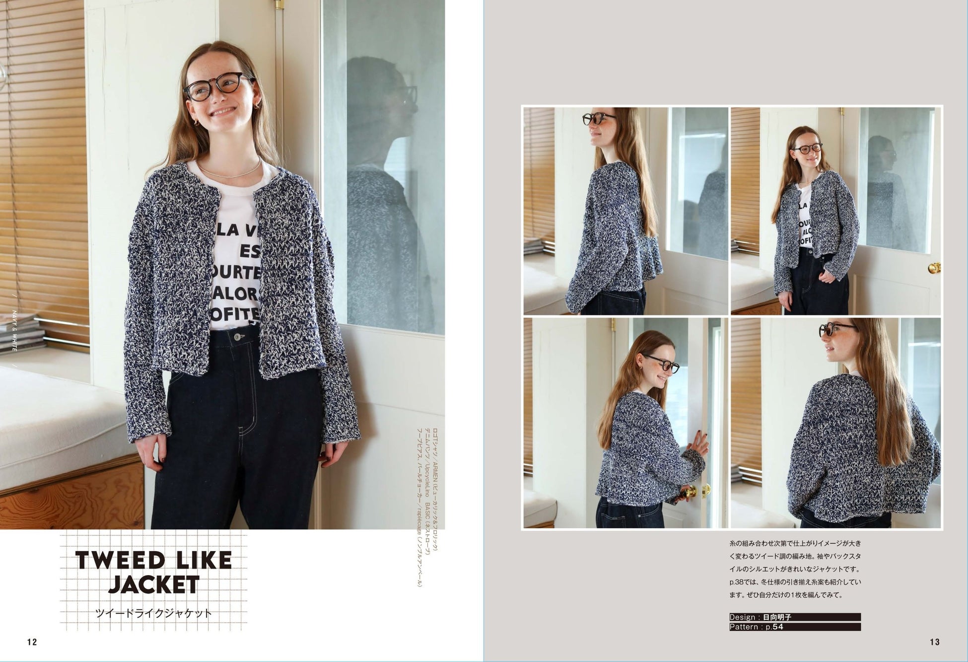 今人気の2~3本の糸を一緒に編む「引き揃え」をテーマに、ツイード風ジャケットやベスト、ビスチェなどのウエアや、ショールやバッグ、スマホストラップなどのニット小物を1年中使えるレシピで展開。引き揃えだからこそ出せる風合いや素材感、色の組み合わせが楽しめます。