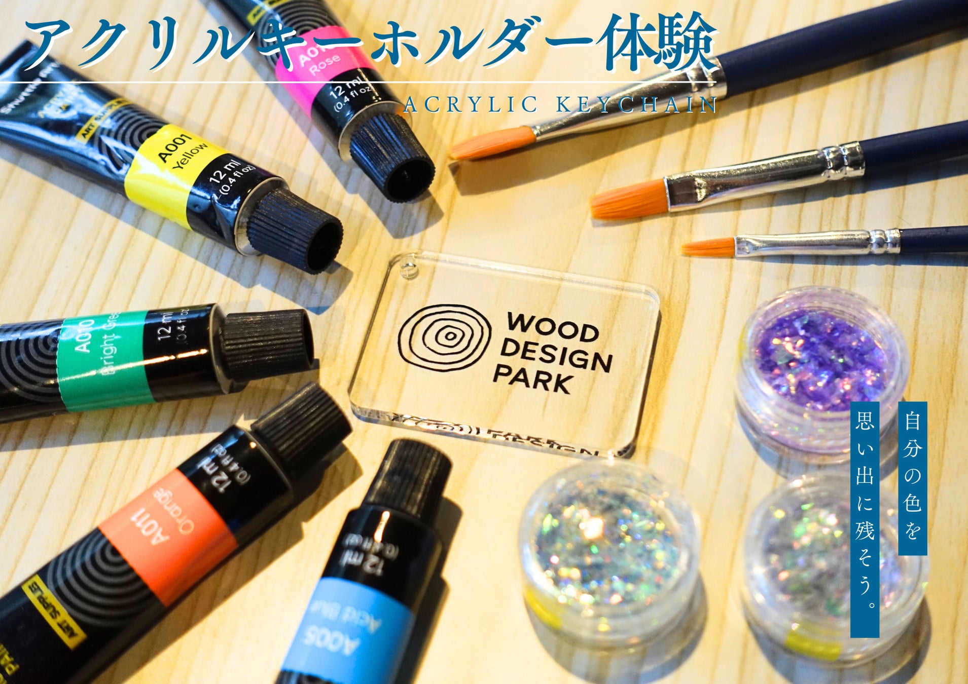 「オリジナルアクリルキーホルダー色付け体験」ウッドデザインパーク与位にて、ゴールデンウィークより提供開始。