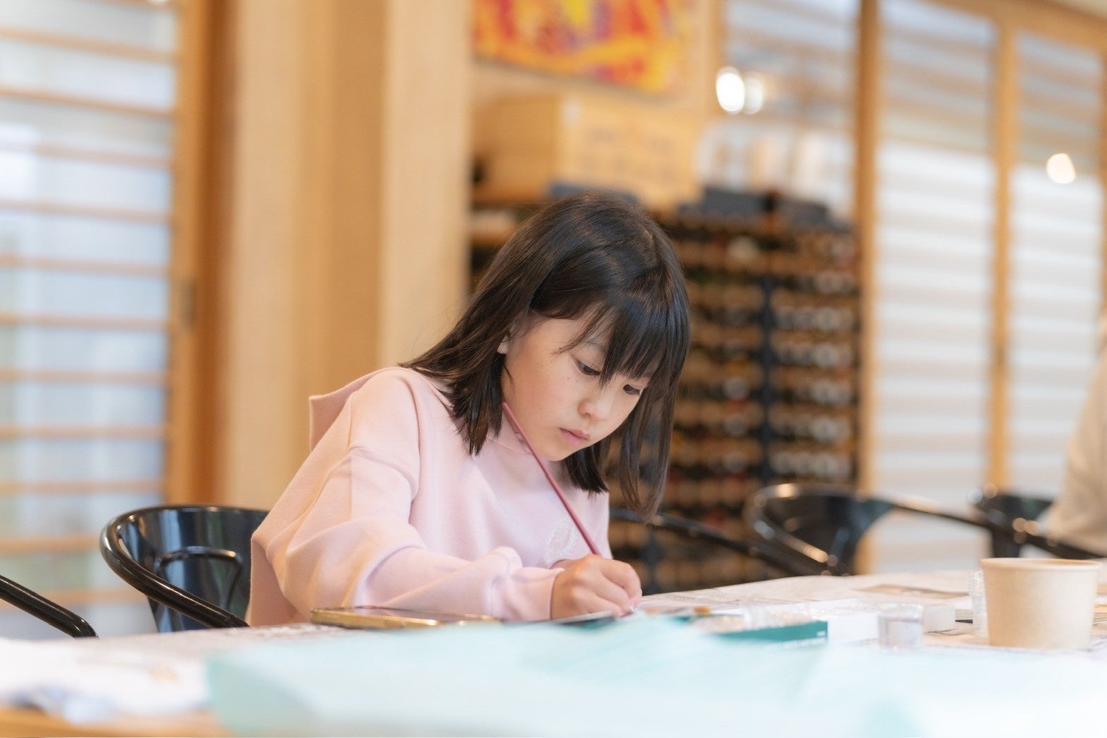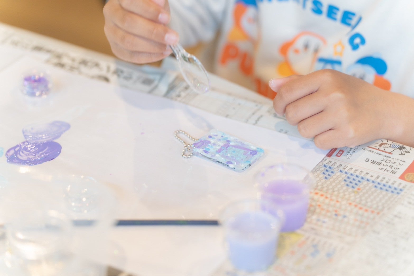 あらかじめ用意されたアクリルキーホルダーに思い思いの色をのせ、自分だけのキーホルダーを作ることができます。小さなお子様から大人まで気軽に参加が可能。