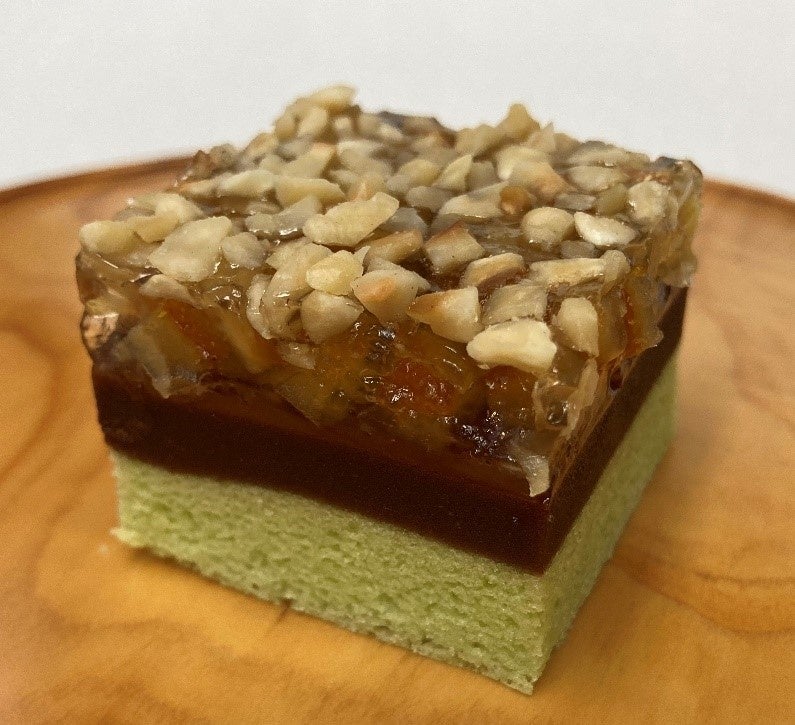 金沢のお菓子である「冬まつ」を、今回のイベントのために特別にアレンジしました。蒸しカステラ「浮島」の上にチョコレート羊羹、オレンジ羹、そしてくるみの代わりにヘーゼルナッツをあしらいました。