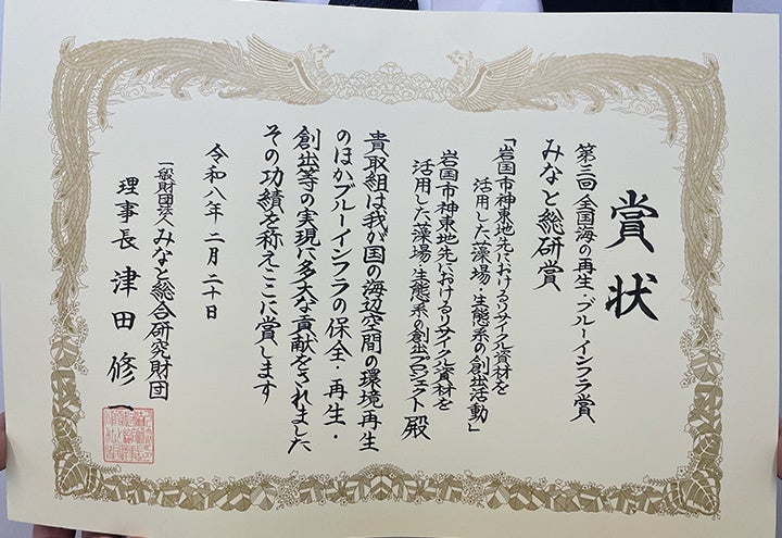 宇部工業高等専門学校(山口県宇部市 校長:金寺登 以下「宇部高専」)は、神代漁業協同組合、岩国市およびJFEスチール株式会社と共同で実施している「岩国市神東地先におけるリサイクル資材を活用した藻場・生態系の創出活動」が、みなと総合研究財団主催の「第3回 全国海の再生・ブルーインフラ賞」において「みなと総研賞」を受賞しました。授賞式は2月20日、広島港クルーズターミナルにて執り行われました。本活動は、リサイクル資材を活用した藻場造成とブルーカーボン創出の先進的取組として高く評価されたものです。