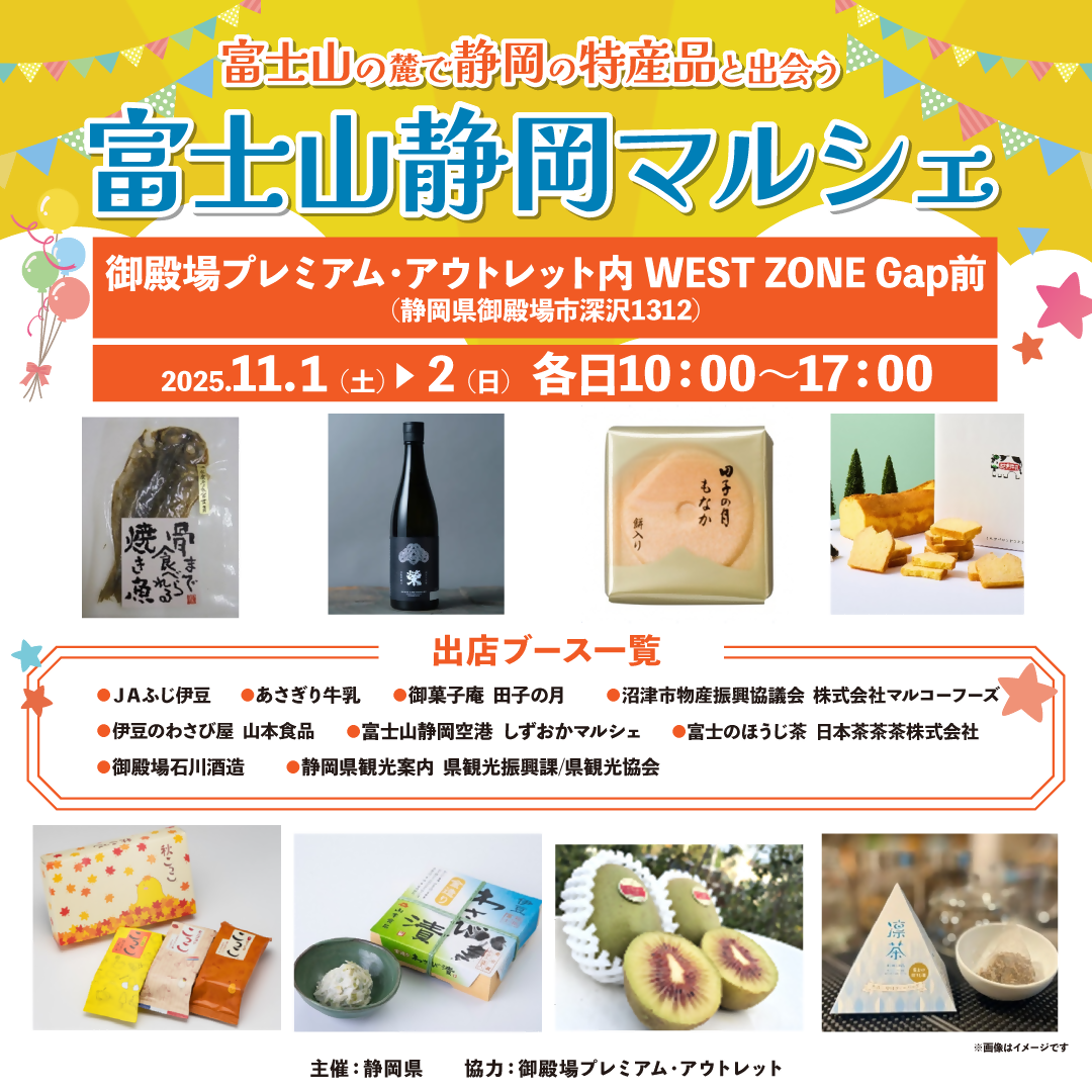 御殿場プレミアム・アウトレットにて、11月1日(土)と2日(日)の両日、県内の事業者等9者が出店する「富士山静岡マルシェ」を開催します。