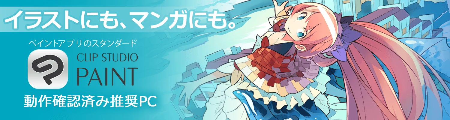 イラスト・マンガ・Webtoon・アニメーション制作に欠かせない気持ち良い描き味と動作、クオリティとスピードを上げる豊富な機能を兼ね備え、プロも愛用するペイントアプリのスタンダード「CLIP STUDIO PAINT」の動作確認済み推奨パソコンです。当社にてCLIP STUDIO PAINT EX Ver.3.0において主要な動作の確認も行っておりますので、安心して人気の「CLIP STUDIO PAINT」をお使いいただくことができます。
