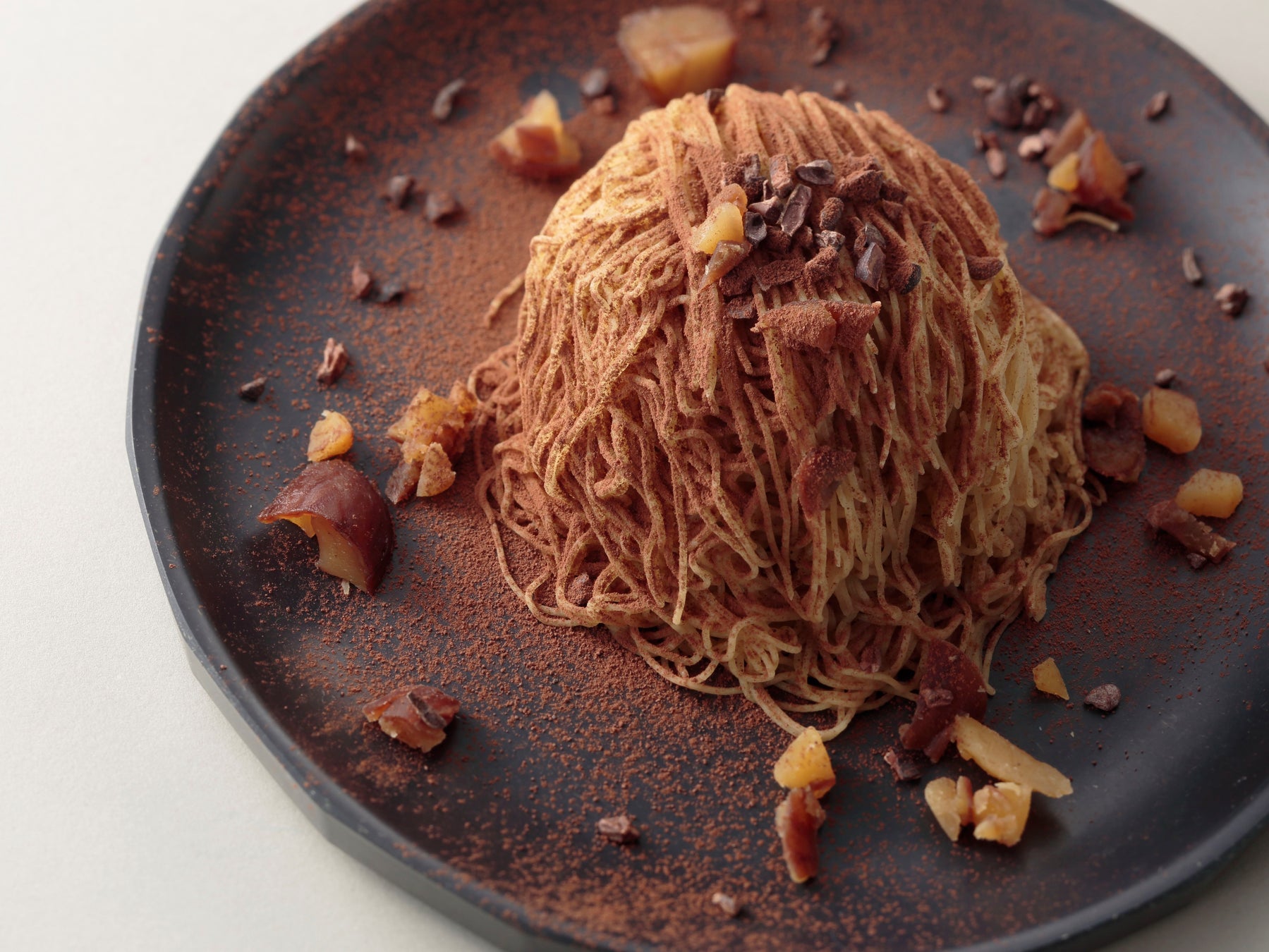 オーダーを受けてから絞る国内産栗を使用したモンブラン。デニッシュにラム酒とコーヒーのシロップを染み込ませ、マスカルポーネクリームと