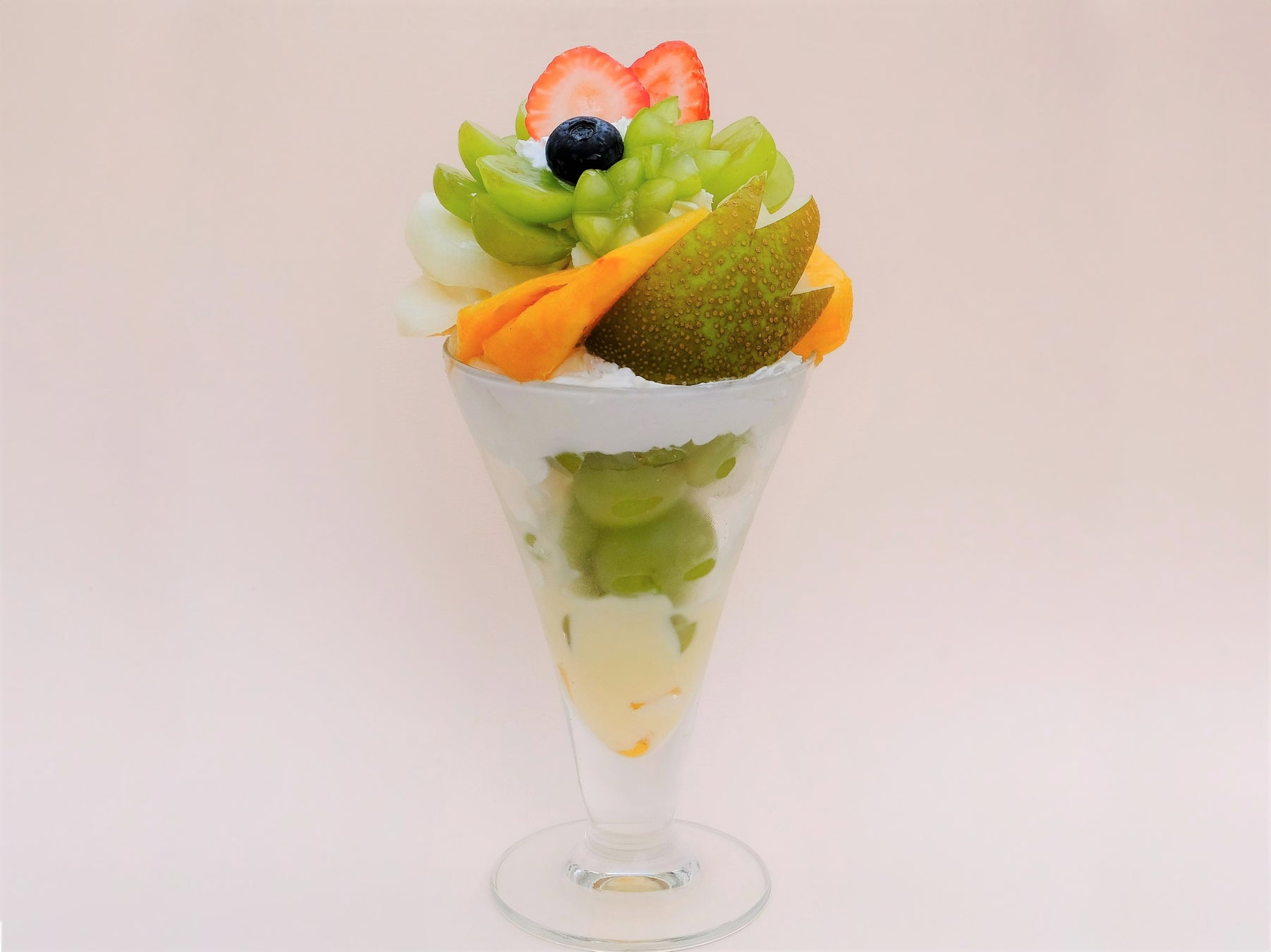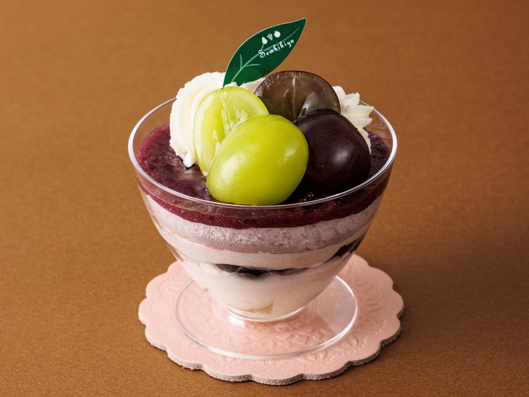 シャインマスカットと黒ぶどう(巨峰またはピオーネ※)の2種類のぶどうを贅沢に使用した限定パフェ。上から生クリームとぶどう、ぶどうジュレ、ぶどう風味のスポンジ、ぶどう生クリーム、ヨーグルトを重ねました。中にもフレッシュなぶどうが隠れています。食べ進めるごとに味の変化も楽しいパフェに仕上げました。